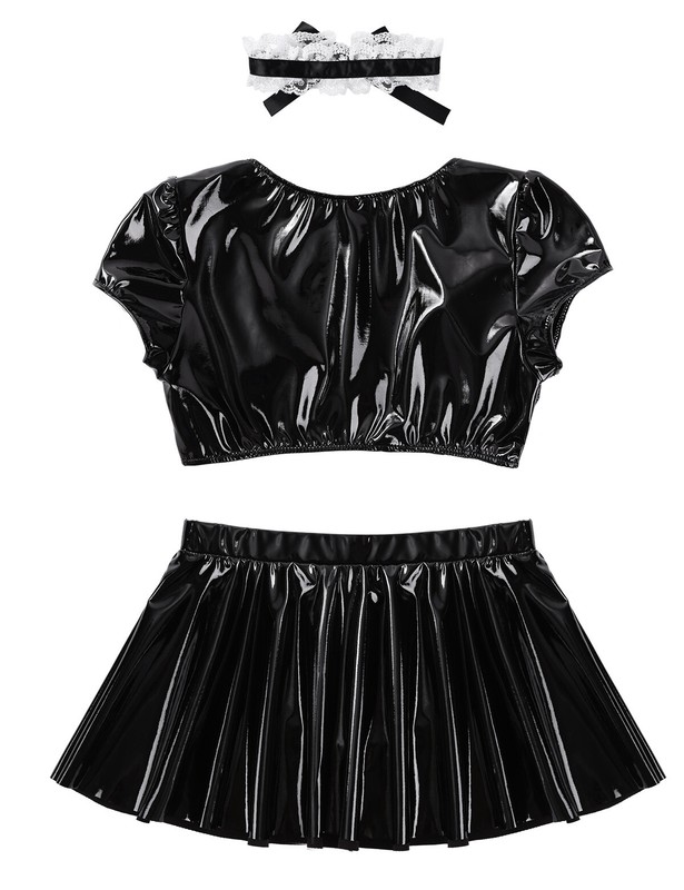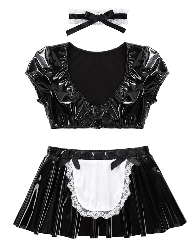 Women’s wet look patent leather maid cosplay costume outfit, flattering and charming.