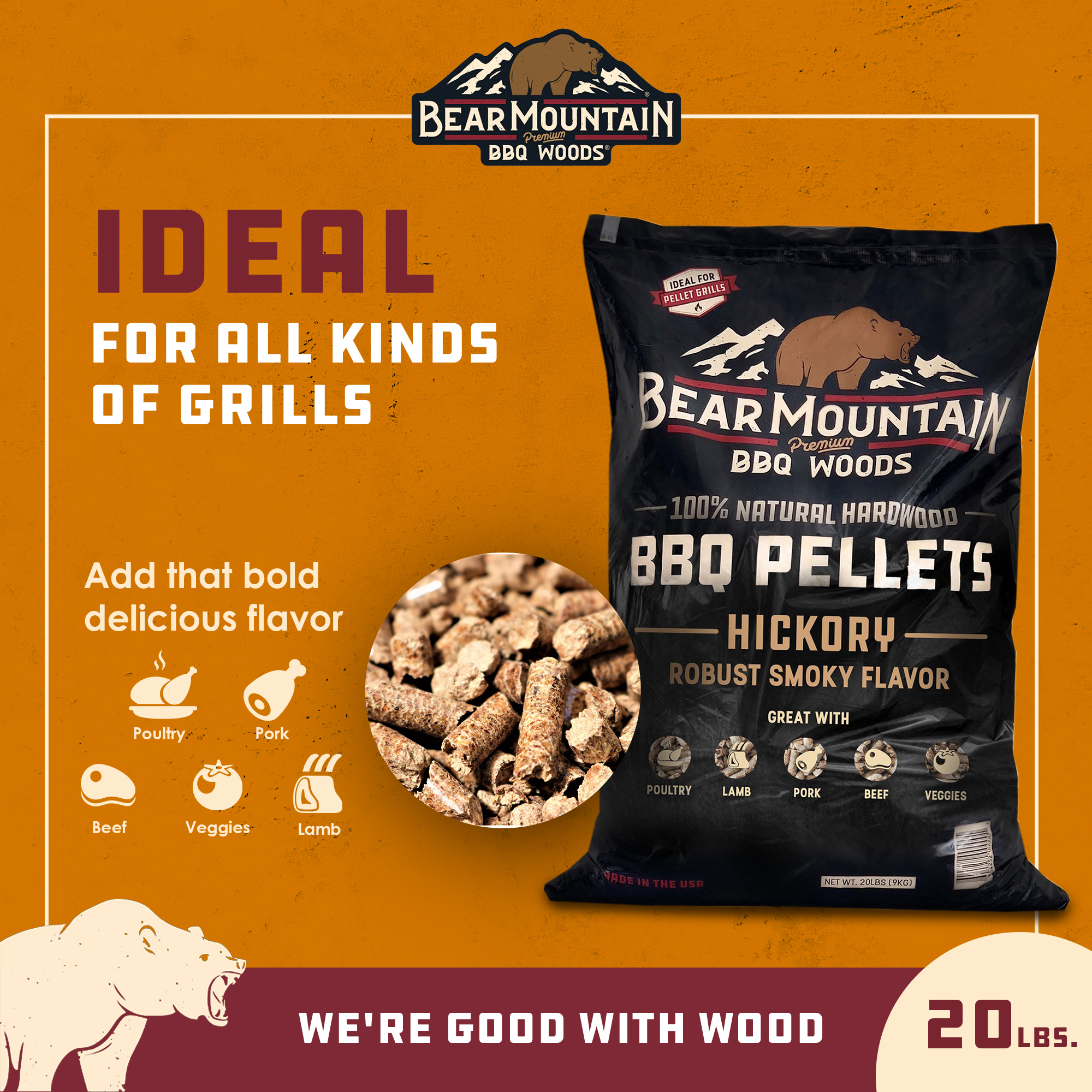 Kick your grilling skills up a notch with Bear Mountain BBQ Premium All-Natural Hardwood Hickory Smoker Pellets.