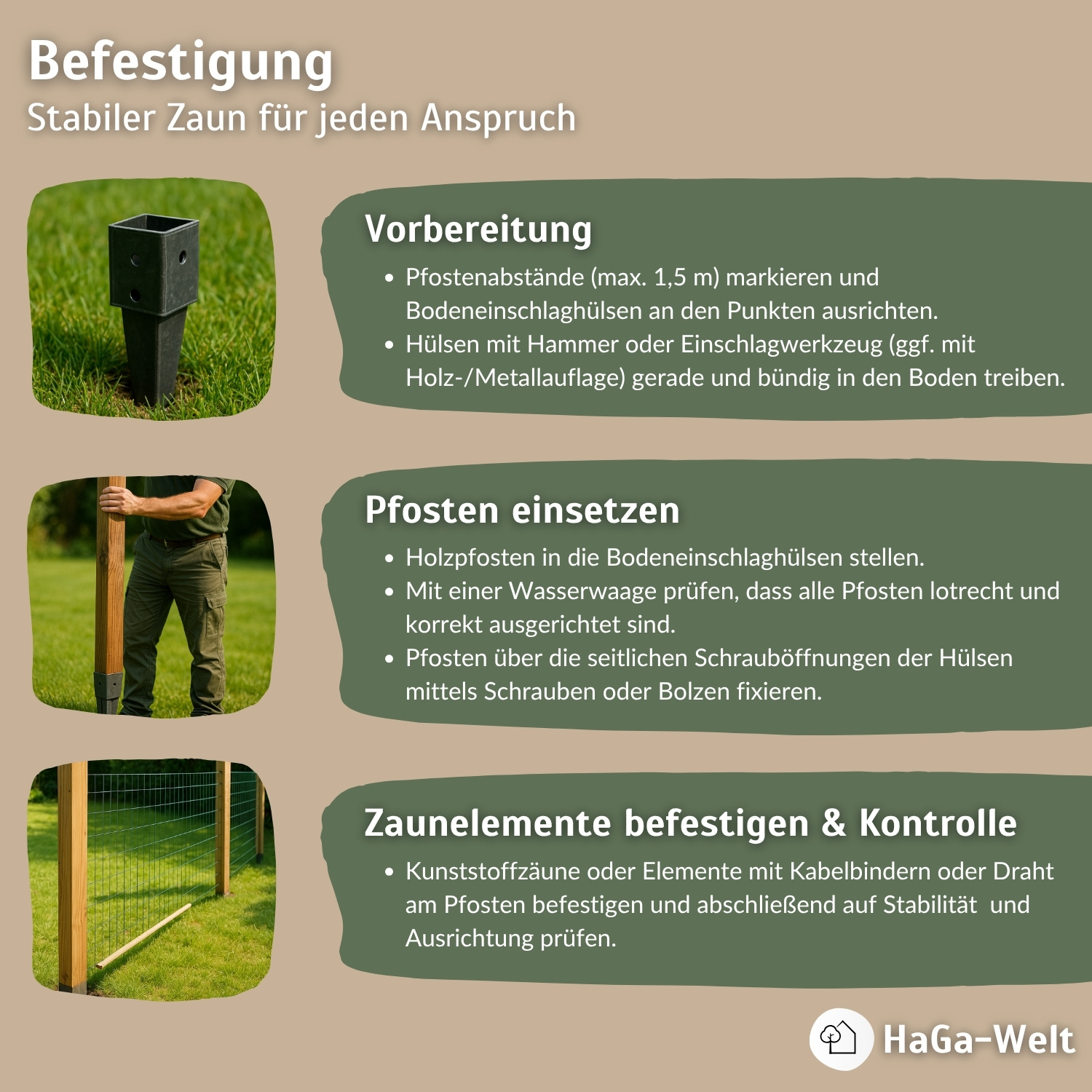 Die Befestigung der Holzpfosten ist auf verschiedene Arten möglich: Sie können sie in Einschlag- oder Aufschraubhülsen einsetzen, um sie sicher im Boden zu verankern, oder sie direkt in die Erde setzen.