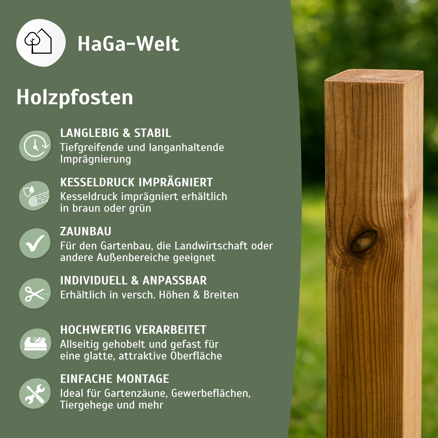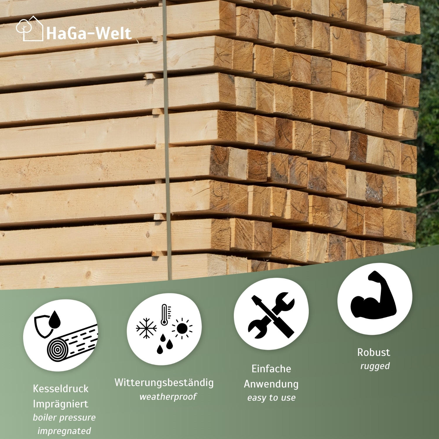 Das Holz ist kesseldruckimprägniert, das heißt: Durch die spezielle Behandlung wird es widerstandsfähiger gegen Feuchtigkeit, Regen und Sonneneinstrahlung. Dank dieser Schutzschicht bleibt der Holzpfosten auch bei anspruchsvollem Wetter länger intakt und verrottet nicht so schnell – ideal für den Außenbereich.