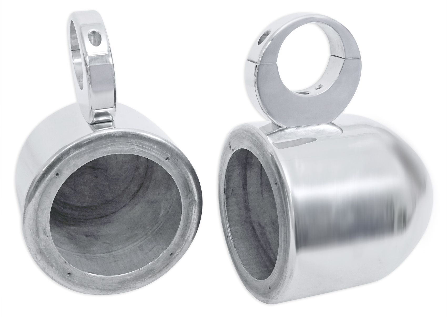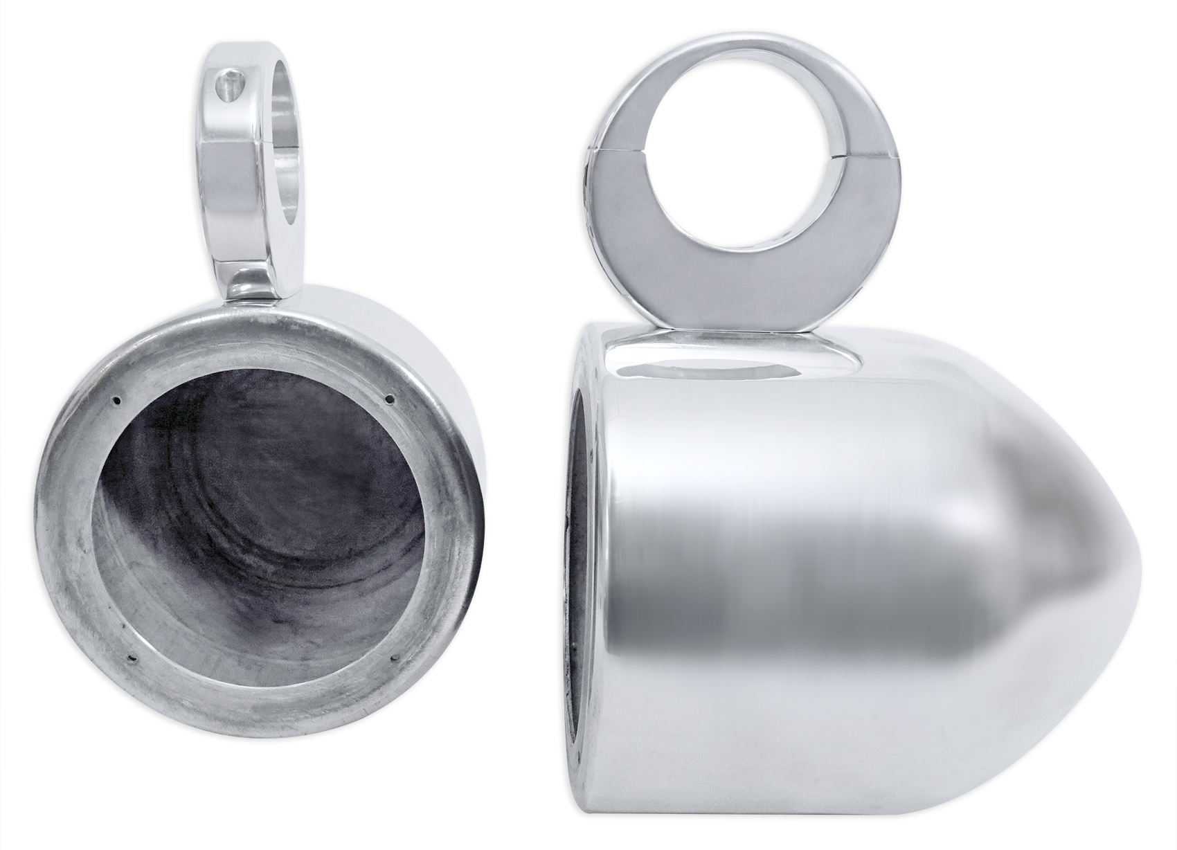 These awesome pods are built of super strong aircraft grade 6061 aluminum. The MAC525S features a silver (chrome) polished finish which offers unparalleled resistance to chipping, scratching, and fading. They are fully marinized which means they’ll withstand the elements on the water. These cans are 100 % waterproof. What makes our technology the best on the market is that our pods are internally wired! This means the terminals are inside the pod and the wires are fed through pre-drilled holes on the pod and clamp. Simply align the wire opening with the hole on your tower and you are done! No exposed wires or terminals! Aluminum cans will last forever!