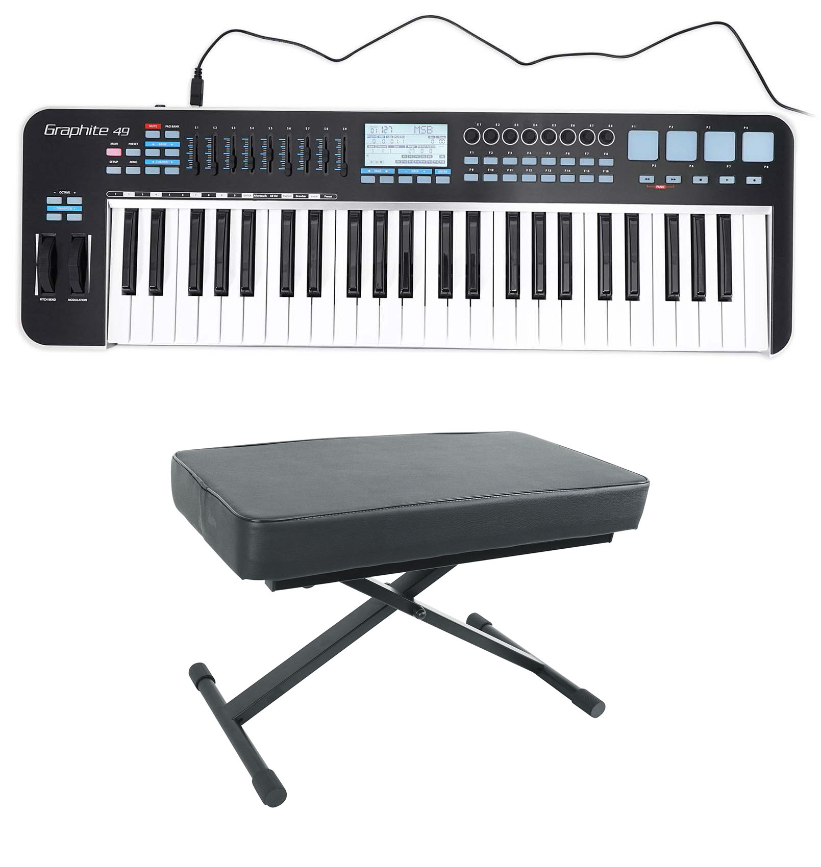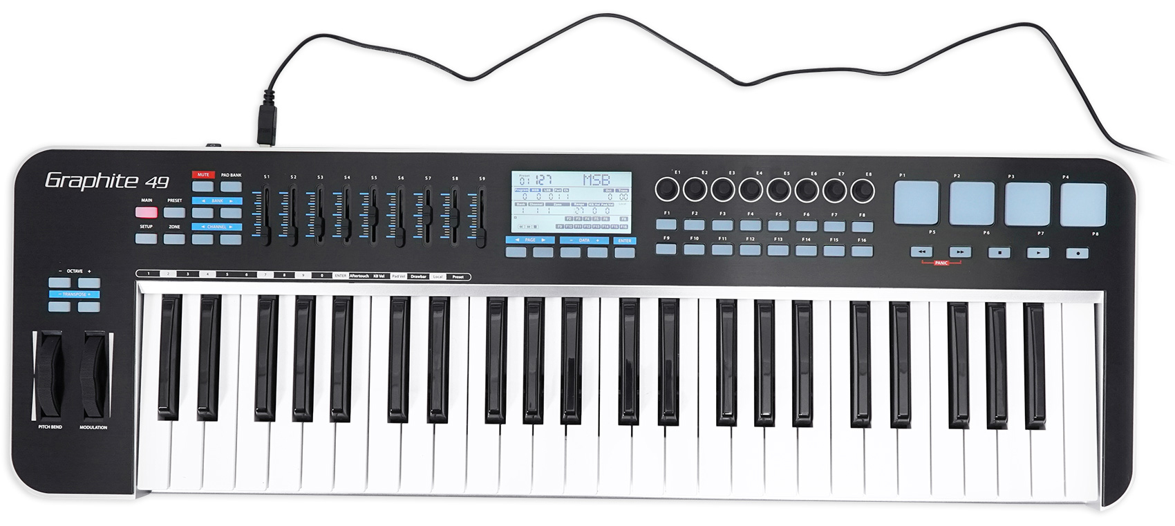 Take full control of your DAW and virtual instruments with the Graphite 49’s controller functions. It features 9 faders, 8 encoders and 16 buttons, all customizable for the ultimate in hands-on control. Not only are they customizable, they can be programmed on-the-fly without the need for editor software. The Graphite 49’s large LCD screen displays the behavior of every function in real-time, enabling intuitive mapping with any software you’re using.