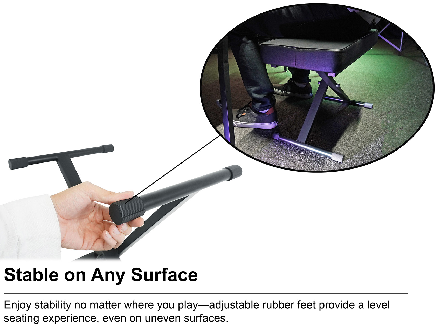 The rubber feet are fully adjustable making the the bench stable even on an un-even floor!