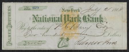 RN-B1. New York, N.Y. National Park Bank, Palmer Brothers bank check. 1867-68. Green on white. Printed by Wm. Everdell's Sons, 104 Fulton St. N.Y. Arm and hammer. Used, VF