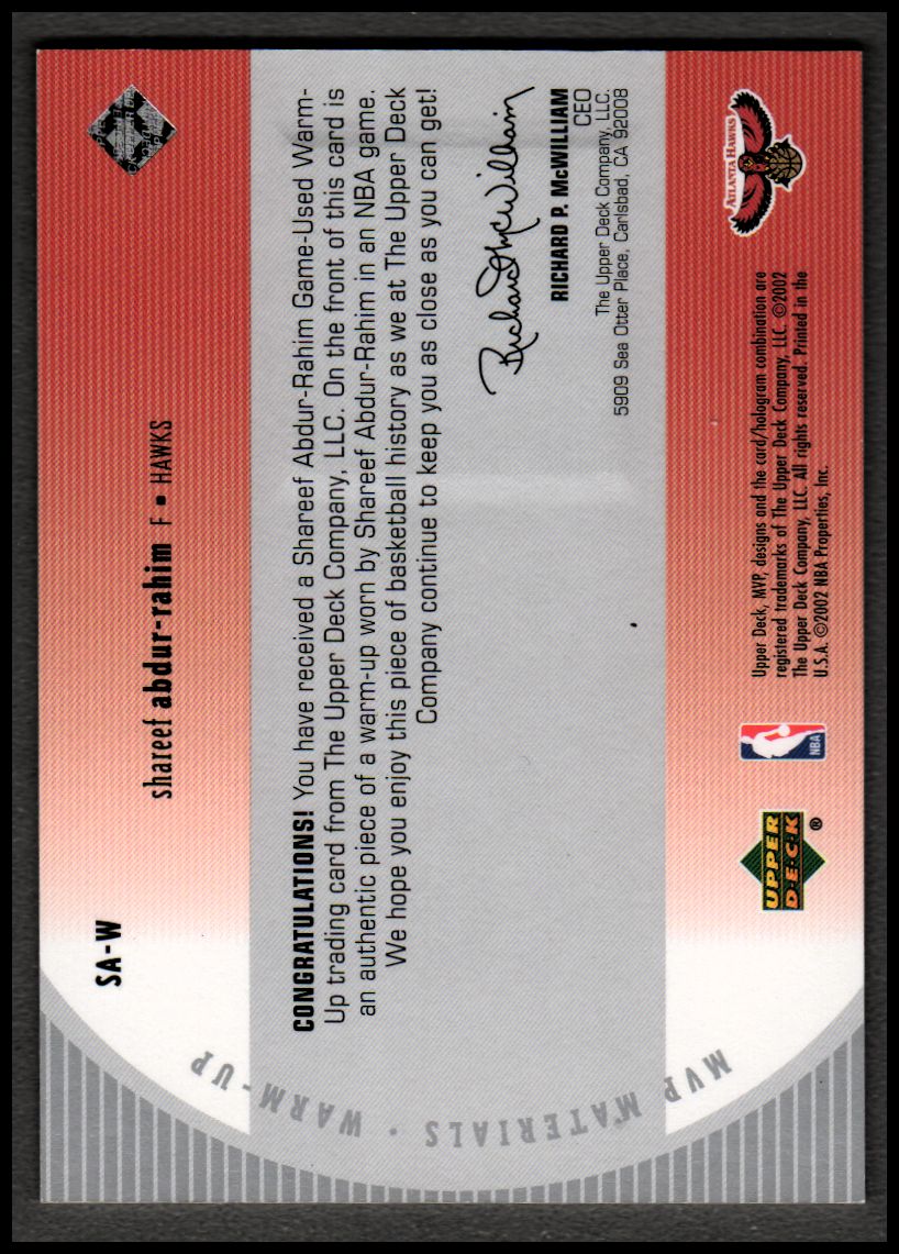 2002-03 Upper Deck MVP Materials Warm Up #SAW Shareef Abdur-Rahim - NM-MT