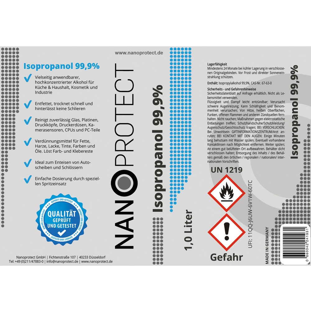 Wer Isopropanol kaufen möchte, sollte wissen, dass Isopropanol reiner Alkohol ist. Dadurch ist das Produkt unbegrenzt haltbar. Selbst Mischungen mit Wasseranteil von einem oder zwei Teilen Wasser behalten jahrelang ihre Qualität bei. Da es sich um reinen Alkohol handelt, ist das Produkt ausschließlich für die Reinigung, die Desinfektion sowie als Verdünner oder Entfetter anwendbar. Isopropanol eignet sich nicht zum Verzehr!