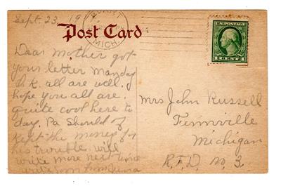 BACK: writing, one cent stamp, 1914 postmark