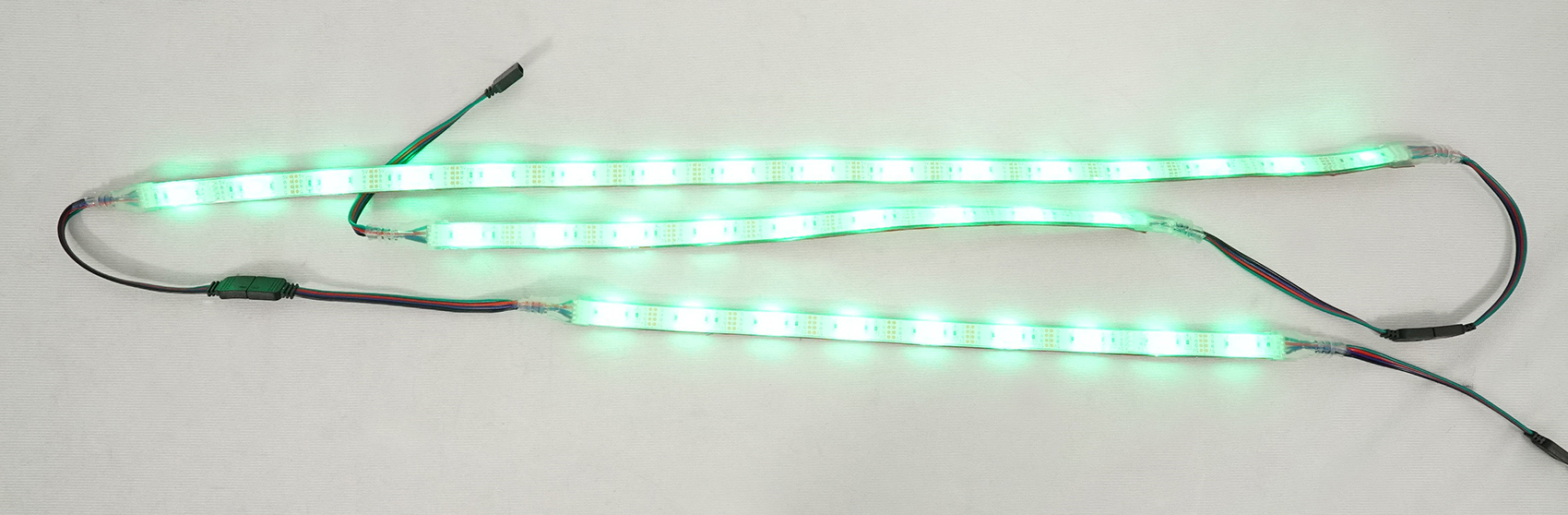 1. We include 3 strips each the perfect length with the perfect cable length. Our top strip is twice as long. Ours is 26 inches (competitors are usually 12 to 15 inches). Ours is the perfect size for TVs ranging from 32 inches to 70 inches. At the end of each strip we have 7 inches of cable so you can plug one strip to the next without excessive amounts of wire all over the place. We intentionally include 3 strips, not 4. Trust me you do not want a strip on the bottom of your TV as I tested this and you will not be able to see the light because the TV blocks it. Also on most TVs there is no place to tape down the bottom strip where it is not in the way. You are better off with 3 strips that are each the proper size.