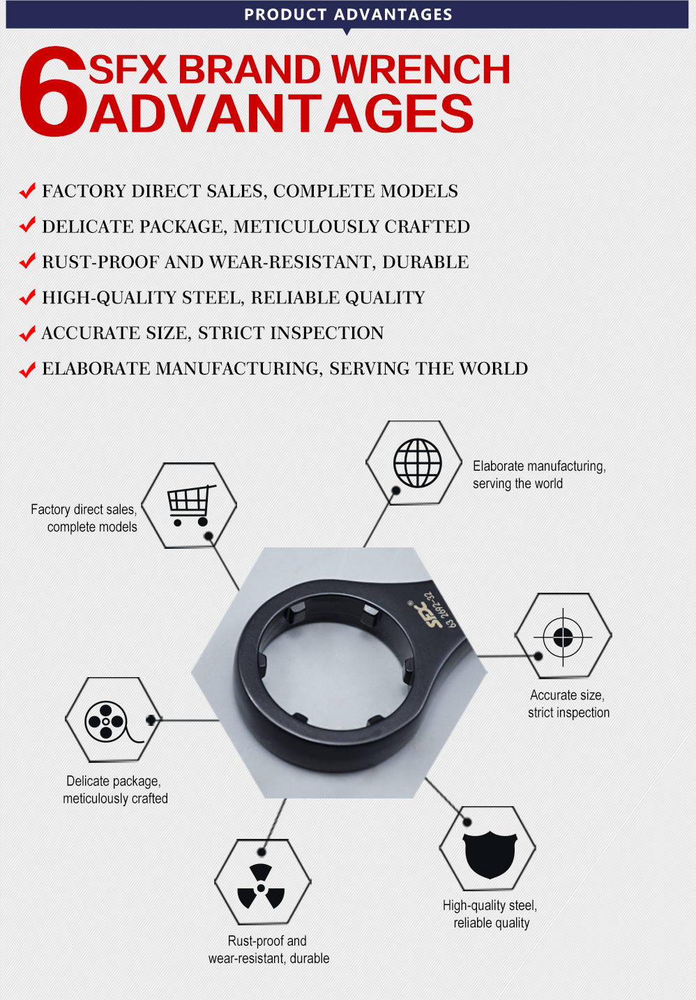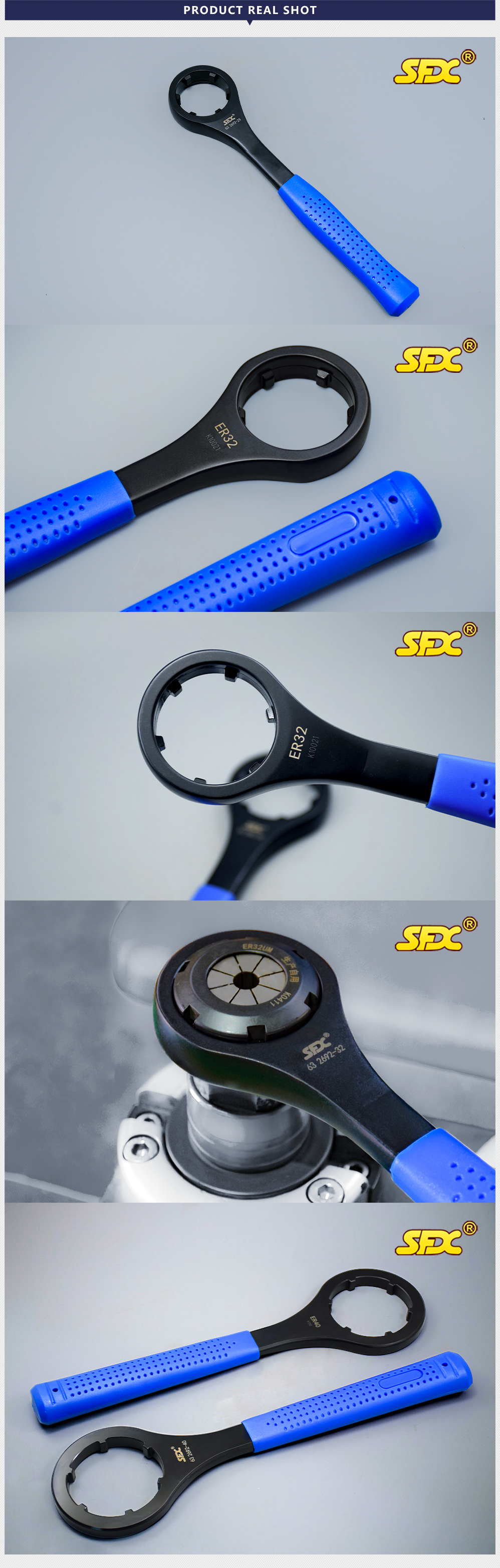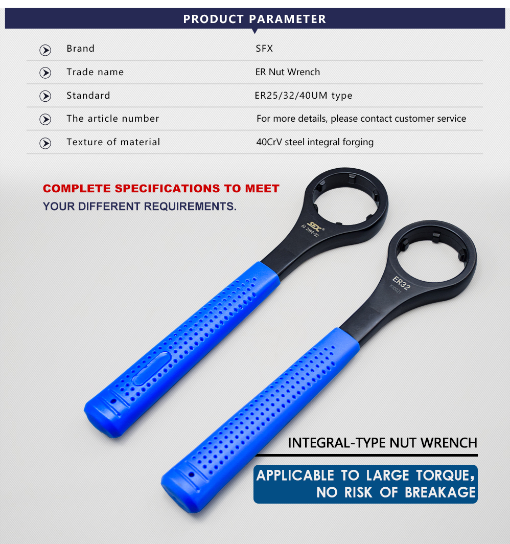 According to the structural characteristics of the ER nuts, the ER nut wrench/spanner has a sleeve hole for clamping the nuts at one end of the handle, which can disassemble the nuts easily, conveniently, and safely without slipping and hurting people;
