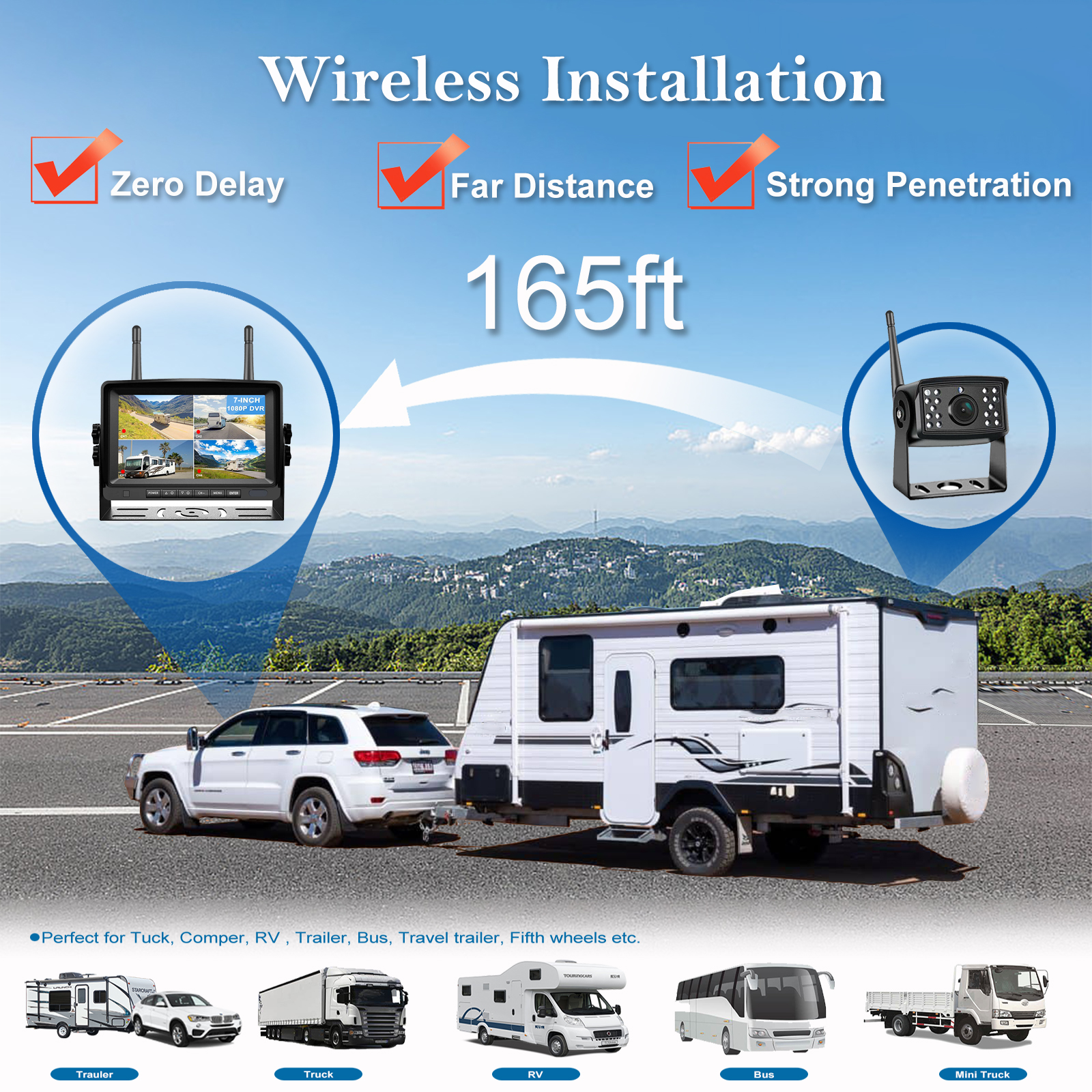 165ft (50m) long distance signal transmission,fit most of vehicles ,such as truck ,semi truck ,box ,comper ,caravan ,motohome,bus etc.