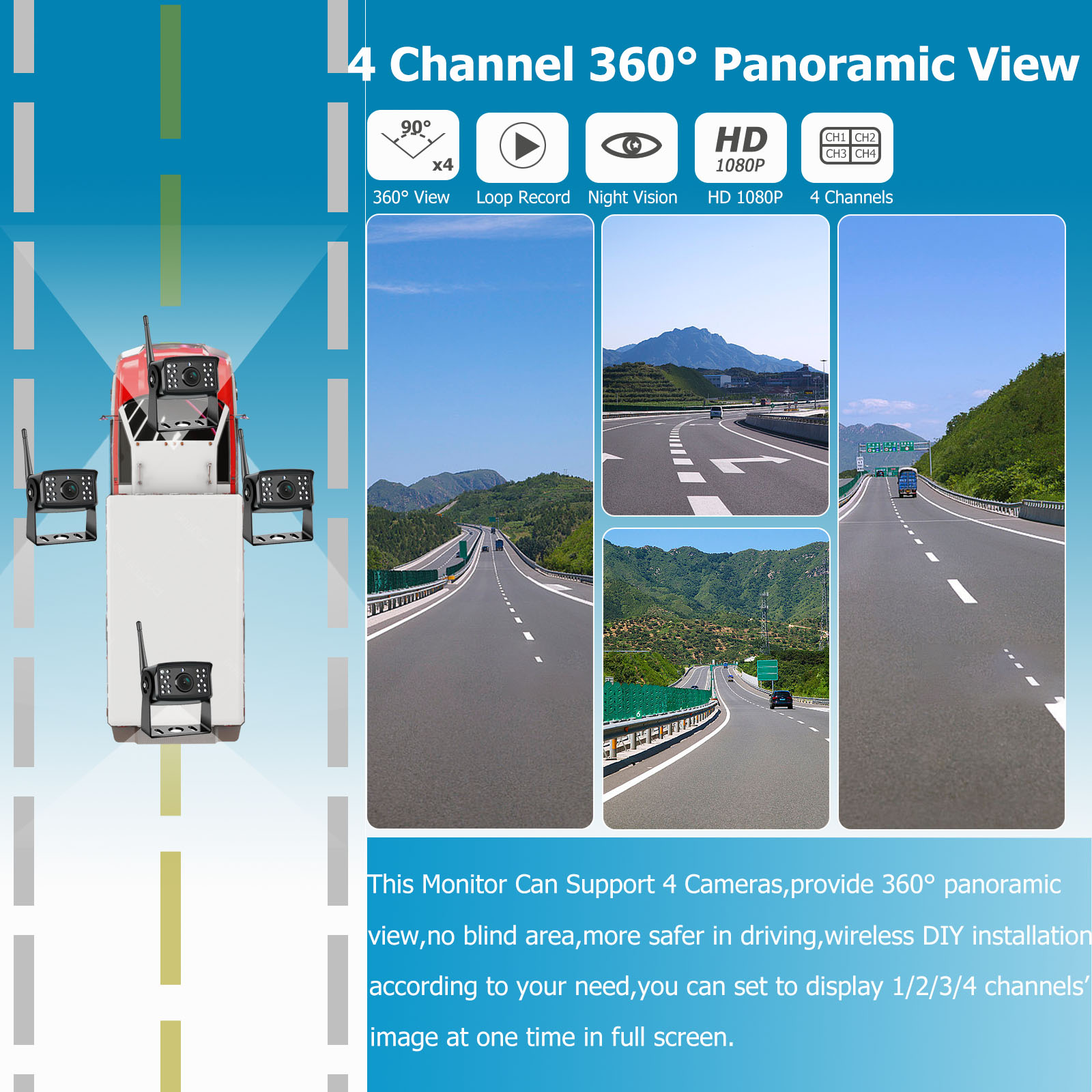 360 degree panoramic view ,4 channels' camera provide front + rear + left +right view.