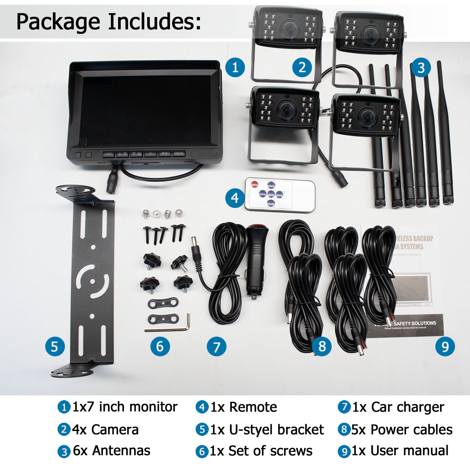 Easy installation, just provide DC 9-24V power for monitor and cameras ,camera can be placed anywhere you want (DIY installation save $200 installation fees).