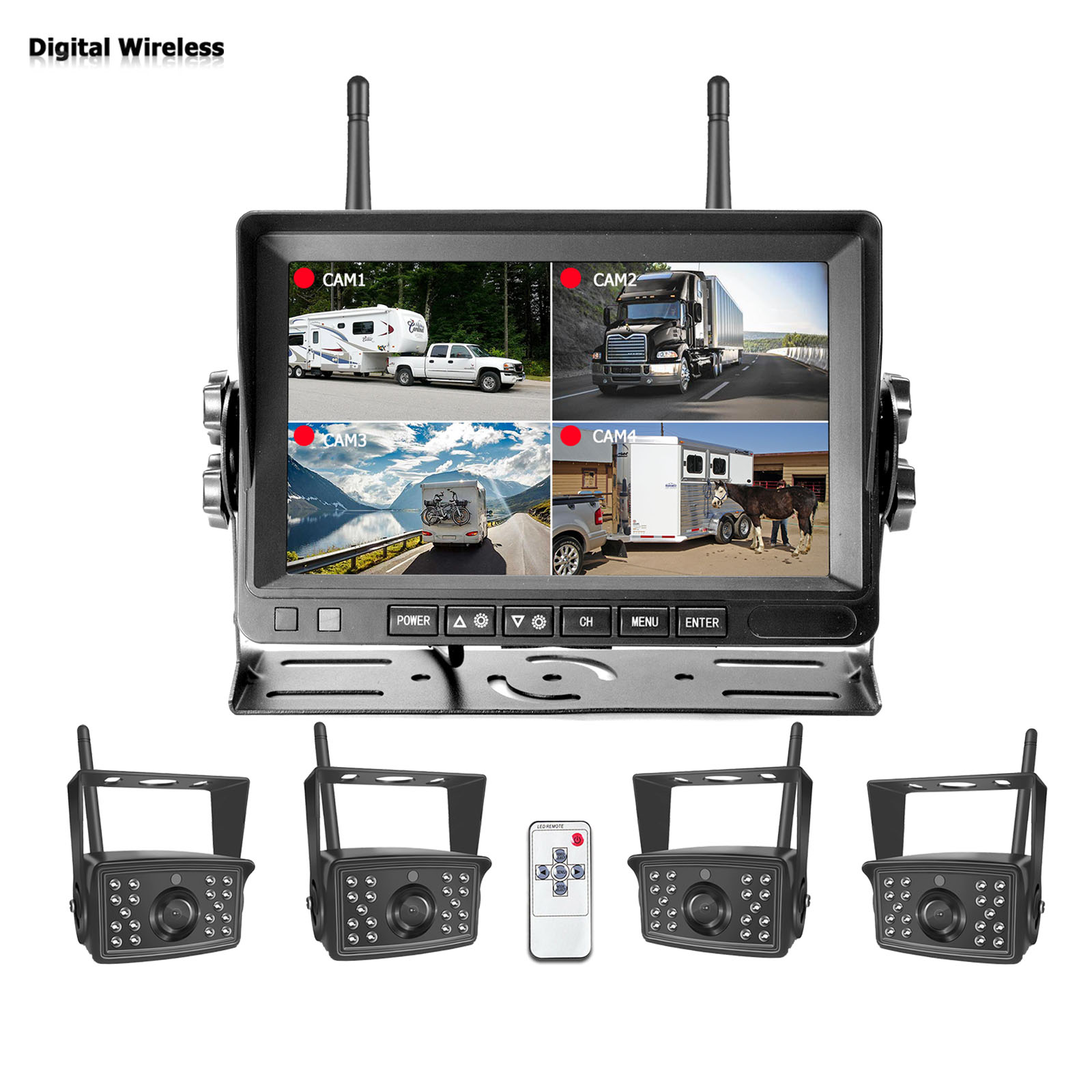 iPoster Digital wireless 4 channels 7 inch monitor DVR & 4 x 1080p IR cameras for truck caravan rear view reverse system.