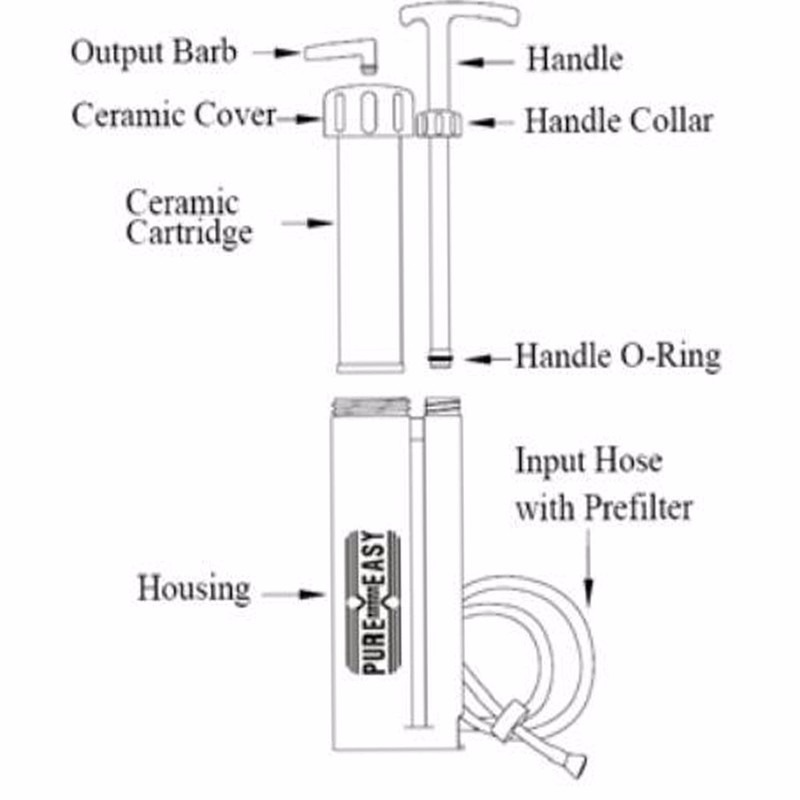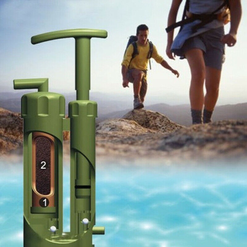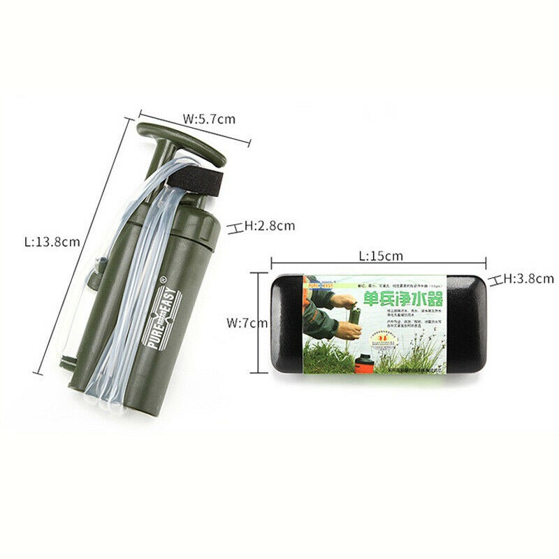 Features: Soldier water filter is the lightest, smallest water filter. It's a good choice for soldiers, hiking, camping, fishing, hunting, climbing, trip/travel, out-door work, survival, emergency and also refugee and rescuer in earthquake or flood area etc. And it is also an affordable source of drinking water for people who live in the conflict area, riot area, remote village and tribe. Also, it's very easy to operate: just pump the handle to instantly remove dangerous contaminants from drinking water. Specification: Smallest: can be held in glasses box. Lightest: Approx 3.10oz (88g) Environment friendly: cleanable filter cartridge. High filtration fineness: unique dual ceramic membranes cartridge with mean pore size of 0.1 micron. Size of ceramic membrane's aperture: 0.1 micron Output: Approx. 0.3 l/min (10 oz. per minute) Capacity: 2,000 liters (530 gallons) Dimensions: 13.8 X 5.7 X 2.8cm(Approx) Material: ABS plastic, Ceramic, Nano-metal clusters media (NMC) Unique dual ceramic membranes cartridge 1.Entirely removes bacteria in water like Escherichia coli,Staphylococcus aureus, Salmonella typhi, Vibrio cholerae, Legionella,pneumophila, Giardia intestinalis. 2.Filters out particles down to 0.1 micron - compare to the best commercially available unit that can only filter down to 0.2 micron! 3.Entirely removes suspended contaminants of protozoa, algae, worms, dusts, etc. Nano-metal clusters media 4.Highly efficiently removes heavy metal ions in water such as Pb2+, Cd2+, Cr6+, As3+, etc. 5. Efficiently decreases organic pollutants. 6.Having a good ability to remove odors and cloudiness. Cleaning Method: If the filter pores of the ceramic are clogged, the ceramic needs to be cleaned. Remove ceramic cartridge by turning ceramic cover counter-clockwise. Clean the ceramic with water, if necessary with the supplied abrasive paper.