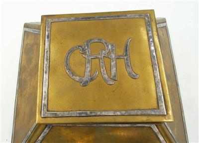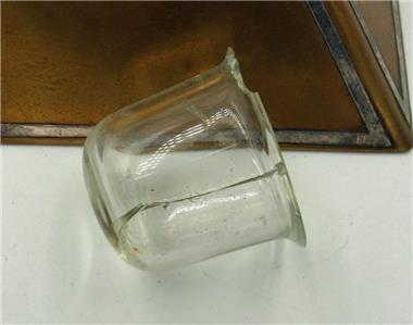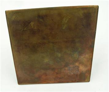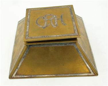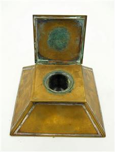 VINTAGE HEINTZ? ART COPPER AND STERLING ARTS AND CRAFTS INKWELL. There are beautiful initials on the top. It's 3" tall and base is 6.5" by 6.5". It is not marked but a style and size telling you it was made by Heinz. Some green oxi as seen in the photos. The glass bowl is chipped but you can easily find a replacement.