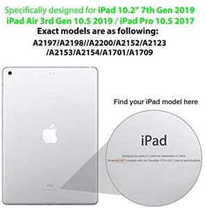 - 🍎 Durable childproof case for Apple iPad 10.2" 7th Generation 2019 (Model Number: A2197 A2200 A2198), iPad Air 3rd Generation 10.5 Inch 2019 (Model Number: A2152 A2123 A2153 A2154), and iPad Pro 10.5 Inch 2017 (Model Number: A1701 A1709 A1852). It will NOT work for any other iPad models. Please check back bottom of your iPad to find the model number