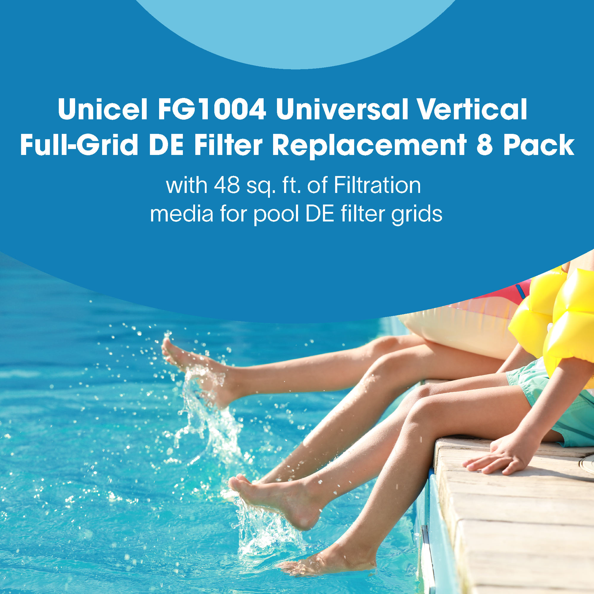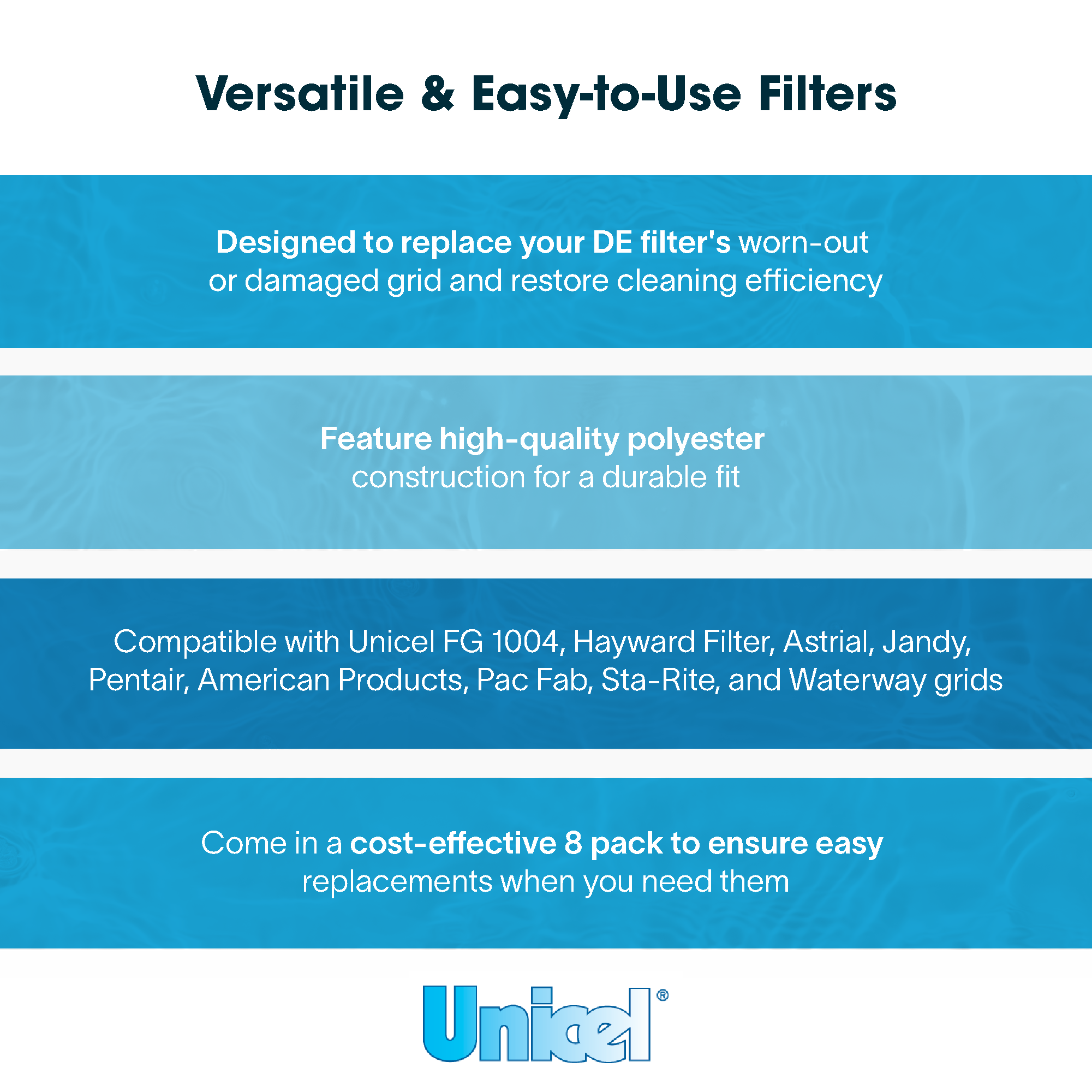 Enjoy your time in the water and get the ultimate pool maintenance solution with this 8-pack of Unicel FG-1004 DE Grid Replacements. Each grid is engineered with fabric that is constructed with a high yarn count of fine denier fiber which yields an optimal permeability to ensure maximum efficiency and durability.