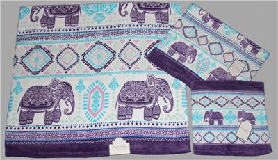 NEW WITH TAGS - Three-Piece Plush Velour Bohemian Decorated Elephants Kassafina 3-Pc Towel Set. Soft colors tones of purple/grape, mint green, aqua, teal blue, and pink on white background. Polka dots, diamonds, and stripes accents. All cotton. Generously sized. Includes: