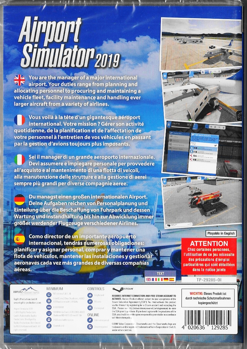 FEATURESRiesiger realistischer AirportFlughafen erweitert sich mit der Erfahrung des Spielers (Landebahn, Gates, Gebäude)Detaillierte Flugzeuge und FahrzeugePersonalmanagement mit SchulungenSimulation von Schäden an Fahrzeugen, Verletzungen und Krankheiten des PersonalsIntelligente KI und Helfer-SteuerungJedes Fahrzeug kann manuell bedient werdenWAS SIE NOCH ÜBER DAS PRODUKT WISSEN SOLLTENNeu und originalverpacktDeutsche Version mit USK KennzeichnungDie Spielhülle beinhaltet nur einen Download-CodeSpielsprache: Keine Spielsprache verfügbarTexte: Deutsch, Englisch, Französisch, Italienisch, Spanisch