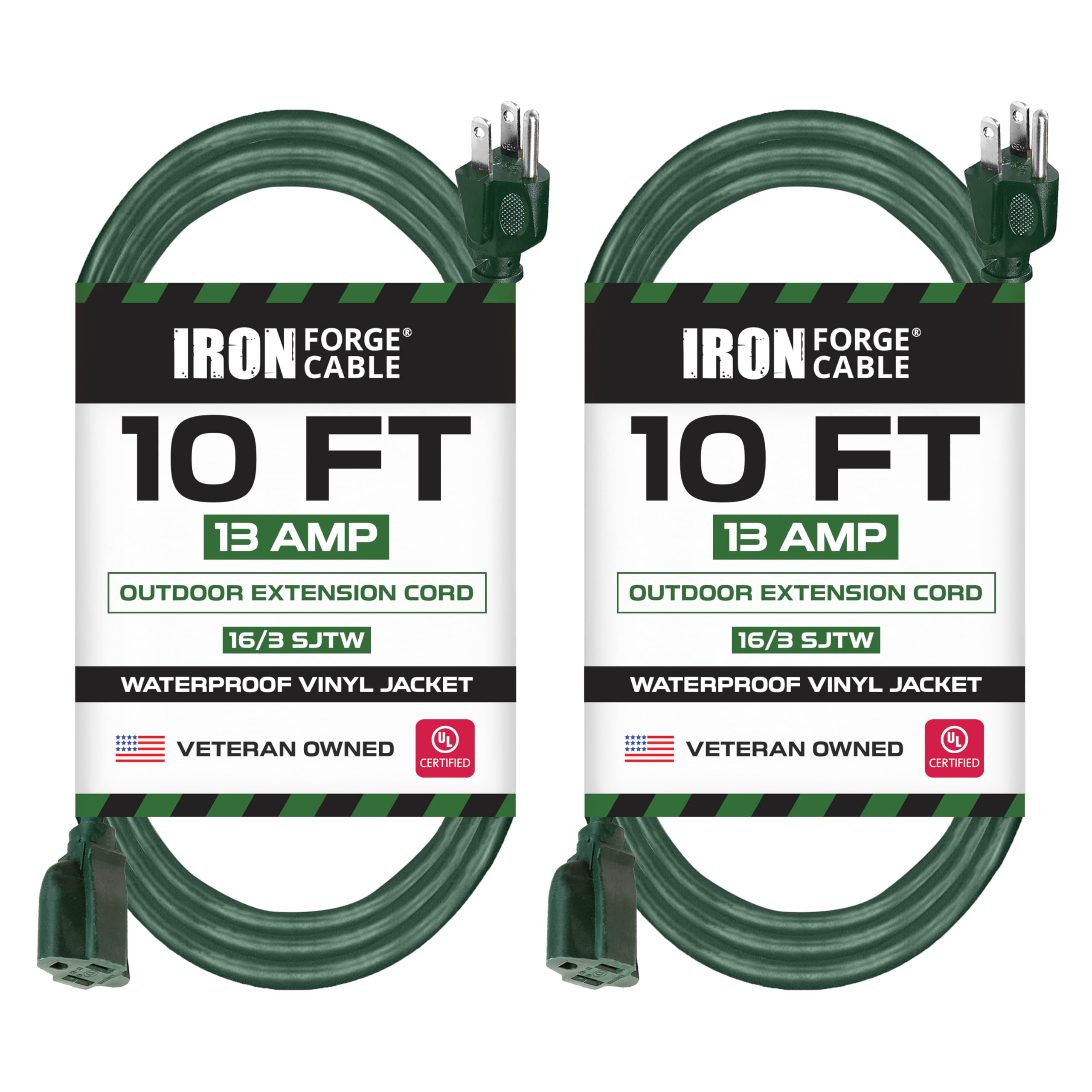 Power your outdoor tools and décor with confidence using the Iron Forge Cable 10ft extension cord, a rugged and reliable three prong extension cord designed for year-round use; this electric extension cord features a durable SJTW vinyl jacket that resists water, snow, sunlight, and corrosion, making it the ideal heavy duty outdoor extension cord for landscaping, holiday lighting, power tools, and yard equipment, while its 16/3 gauge wiring and grounded plug ensure safety and performance; the subtle green color blends into outdoor environments, and reinforced nickel-coated prongs prevent bending and breaking; whether you're using it for lawnmowers, trimmers, or outdoor appliances, this electric cord extension offers secure and stable power across 10 feet; backed by a U.S. veteran-owned business, Iron Forge Cable delivers dependable quality and unmatched customer support with every 10ft extension cord.