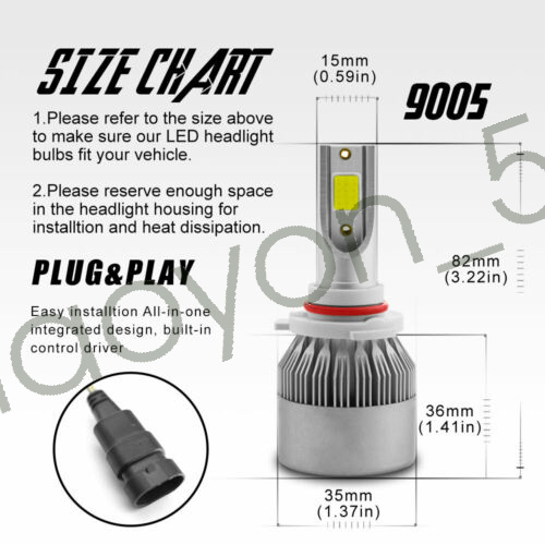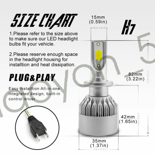 1. Voltage: DC 9-32V ( Fit 12V,24V Vehicle ) 2. IP Rate: IP68 3. LED type: COB LED(Headlight) 4. Color Temperature: ICE Blue 8000K 5. Heat Dissipation Theory: Heat Pipe Technology + A380 Aluminum Heatsink 6. Application: Headlight Lights 7. For a few newest years make cars(About 0.1%) ,Germany Cars,Dodge ,Jeep,Toyota,Nissan,Ford,Chevy Cars and DRL Model may need add Load Resistors(Not including) to stop flickering Issue or fix error message ) Features: