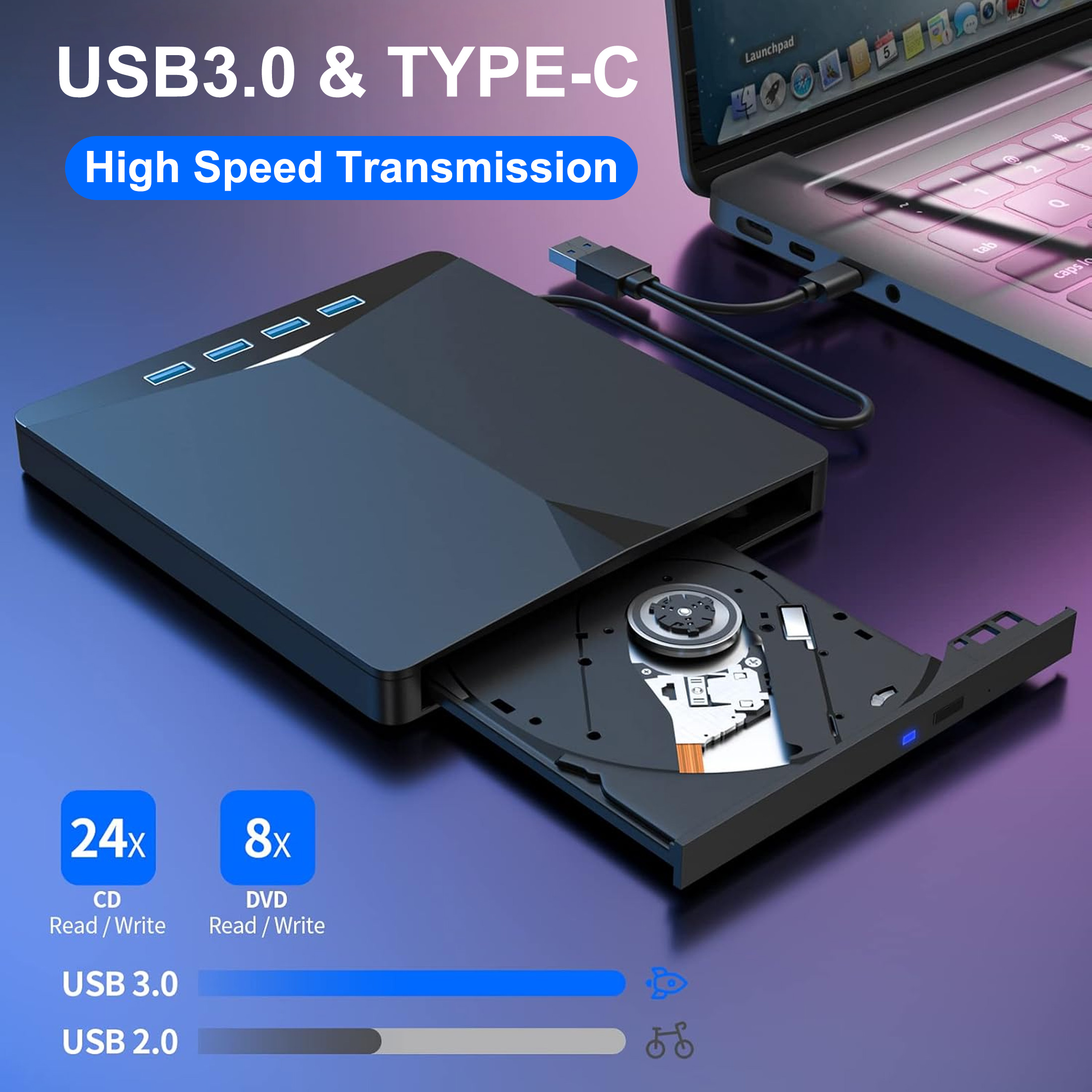 💯👍【High-speed USB 3.0】This DVD drive achieves data rates up to 5 Gbps—about 10 times faster than USB 2.0. Enjoy max 8x DVD and 24x CD Read/Write Speeds without lag. (Backward compatible with USB 2.0.)