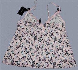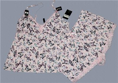 NEW with Tag - Laura Ashley Pink BUTTERFLIES Cami & Shorts Pajamas Set. Adjustable multi-way straps, elastic empire waist, lace on top front. Scalloped lace trim on shorts. Shorts have an elastic waist with tiny pink satin bow. Nice quality, soft stretch, 94% polyester / 6% spandex. Women's sizes. MSRP $36.00.