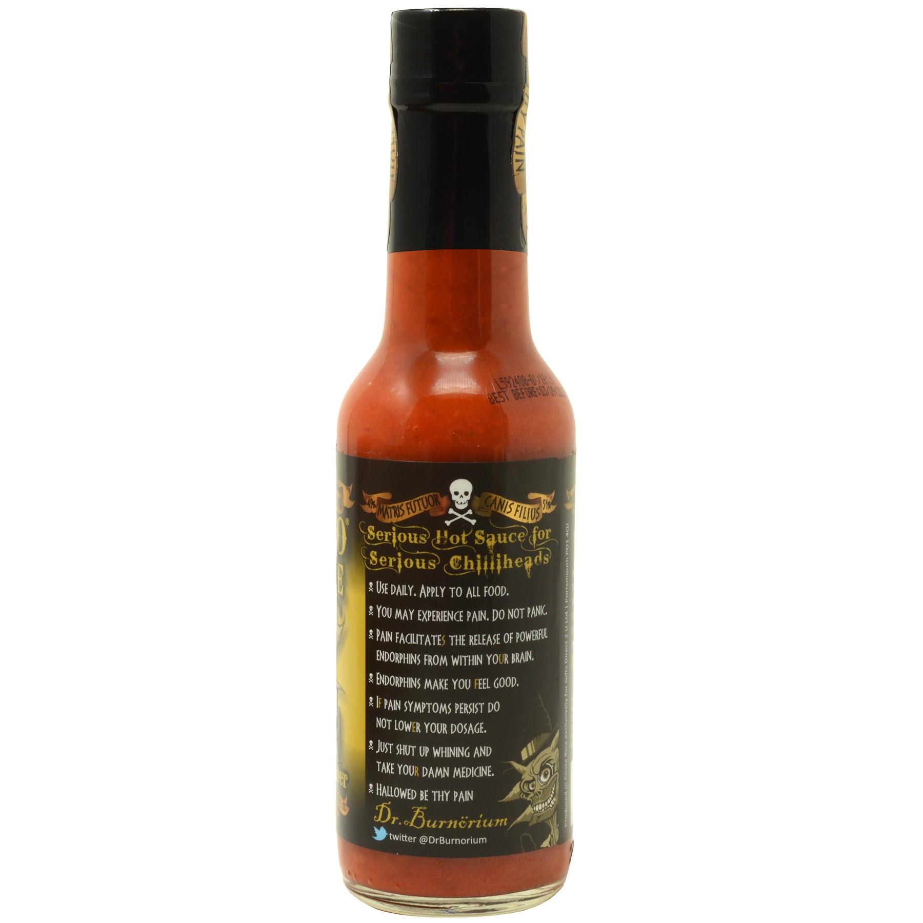 SERIOUS HOT SAUCE FOR SERIOUS CHILLIHEADS. HALLOWED BE THY PAIN. 49% MATRIS FUTUOR - 51% CANIS FILIUS