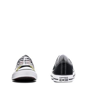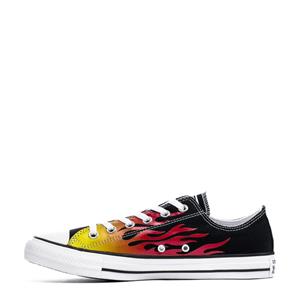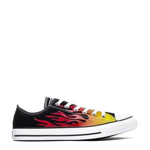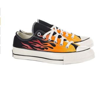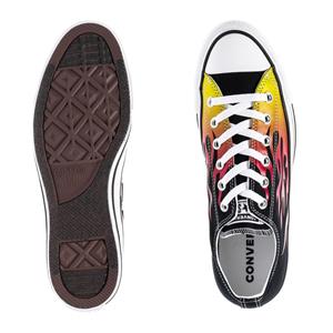 Converse Flames Six Silver Metal Eyelets Ox Shoes. Shiny red, yellow, and orange flames on black canvas. Padded footbed. Men's 5 / Women's 7.