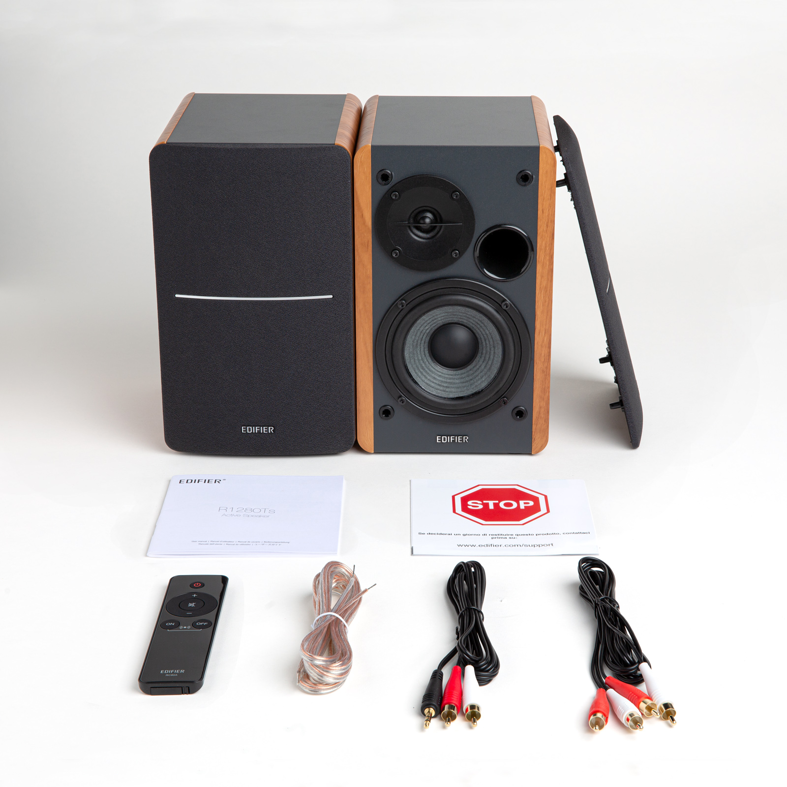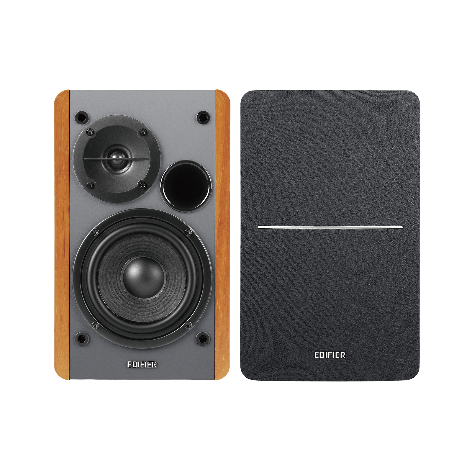 Now you don't have to deal with the trouble of keep plugging and unplugging your speakers to listen to different devices, including your TV! Edifier R1280Ts powered bookshelf speakers allows you to connect to two devices at the same time. Connect to any devices such as your phone, PC, laptop, tablet with included RCA to RCA audio cable, and 3.5 mm-RCA audio cable, and don't have to keep plugging and unplugging all the time. It comes with a wireless remote for your convenience. You can control the speaker wirelessly without leaving the couch. The movable mesh grille effectively protecting the speaker unit. 42W continuous undistorted power, 13mm silk dome tweeter unit, and 4 inches sub-woofer unit all contribute to producing clear quality and life-like sounds. Let’s enjoy listening to your favorite tunes with R1280Ts active bookshelf speakers.