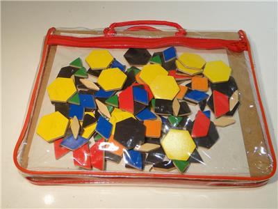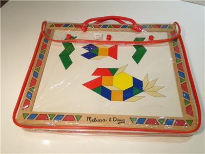 This is for a Melissa and Doug magnetic wood block kit. Comes in its plastic bag. Has a wood board where you slide the sheet of paper in for the child to copy the magnet blocks on the designs. Or make up your own designs. Smoke-free home. Bag is a bit dingy from storage.