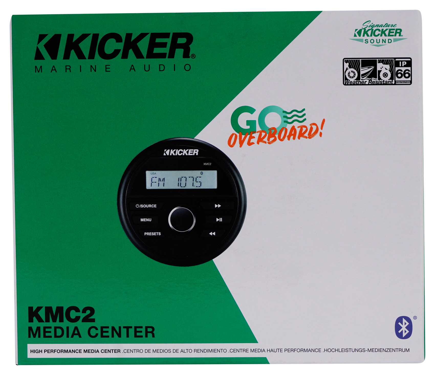 Connect your Bluetooth to the KMC2, plug into the included USB or RCA inputs, or turn on the AM/FM radio. Add a wired KRC12 remote for even more control. This durable media center is ready for some fun on the water!