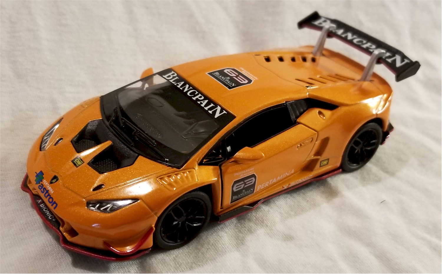 This is a Brand New Kinsmart - 1:36 Scale Model Lamborghini Huracan LP620-2 Orange. The model is about 5 inches long. This model comes with pull back & go and opening doors features. These models come in a big display box and they don't have individual boxes. They will be expertly packed and shipped.