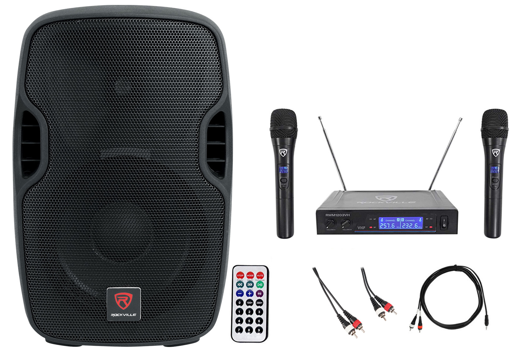 Package: Rockville BPA10 10" 400 Watt Active DJ/PA Speaker With Built In Bluetooth, Remote + Rockville RWM1203VH VHF Wireless Dual HandHeld Microphone System/Digital Display + Rockville RCDR10B 10' Nickel-Plated Dual RCA to Dual RCA Cable - 100 % Copper Top Quality Cable!