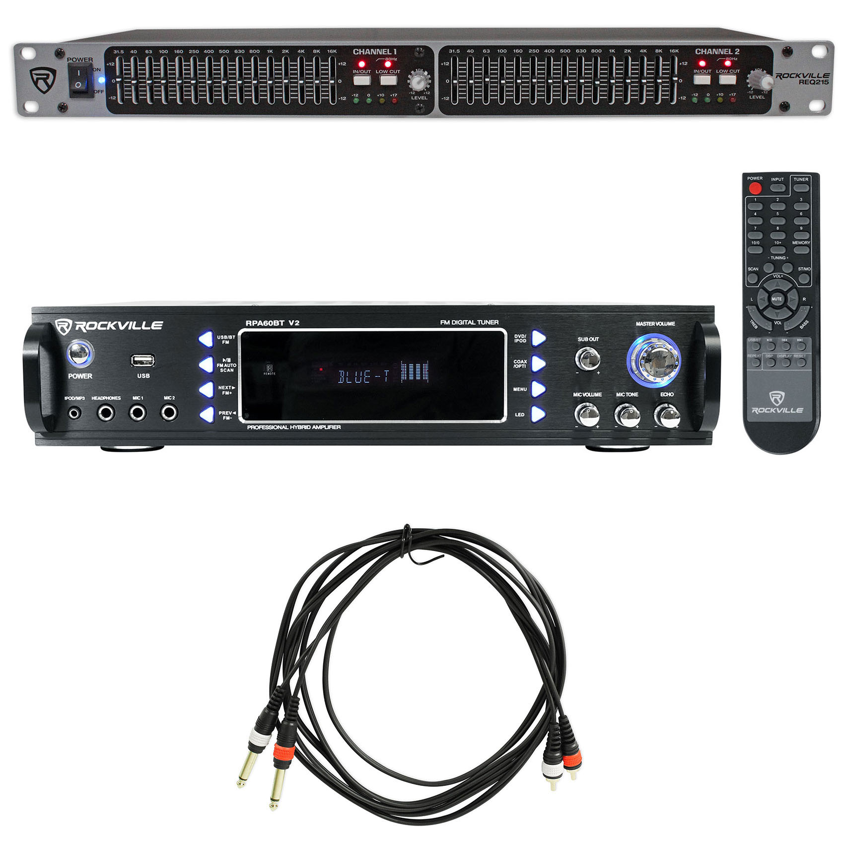 Package: Rockville RPA60BT V2 1000 Watt 2-Ch USB Bluetooth DJ/Pro/Karaoke Amplifier Mixer + Rockville REQ215 Dual Channel 30 Band Rack Mountable Equalizer + Rockville RMDPR10B 10' Nickel Plated Dual 1/4" TS to Dual RCA Cable with 100% Copper Conductors for Enhanced Signal Clarity