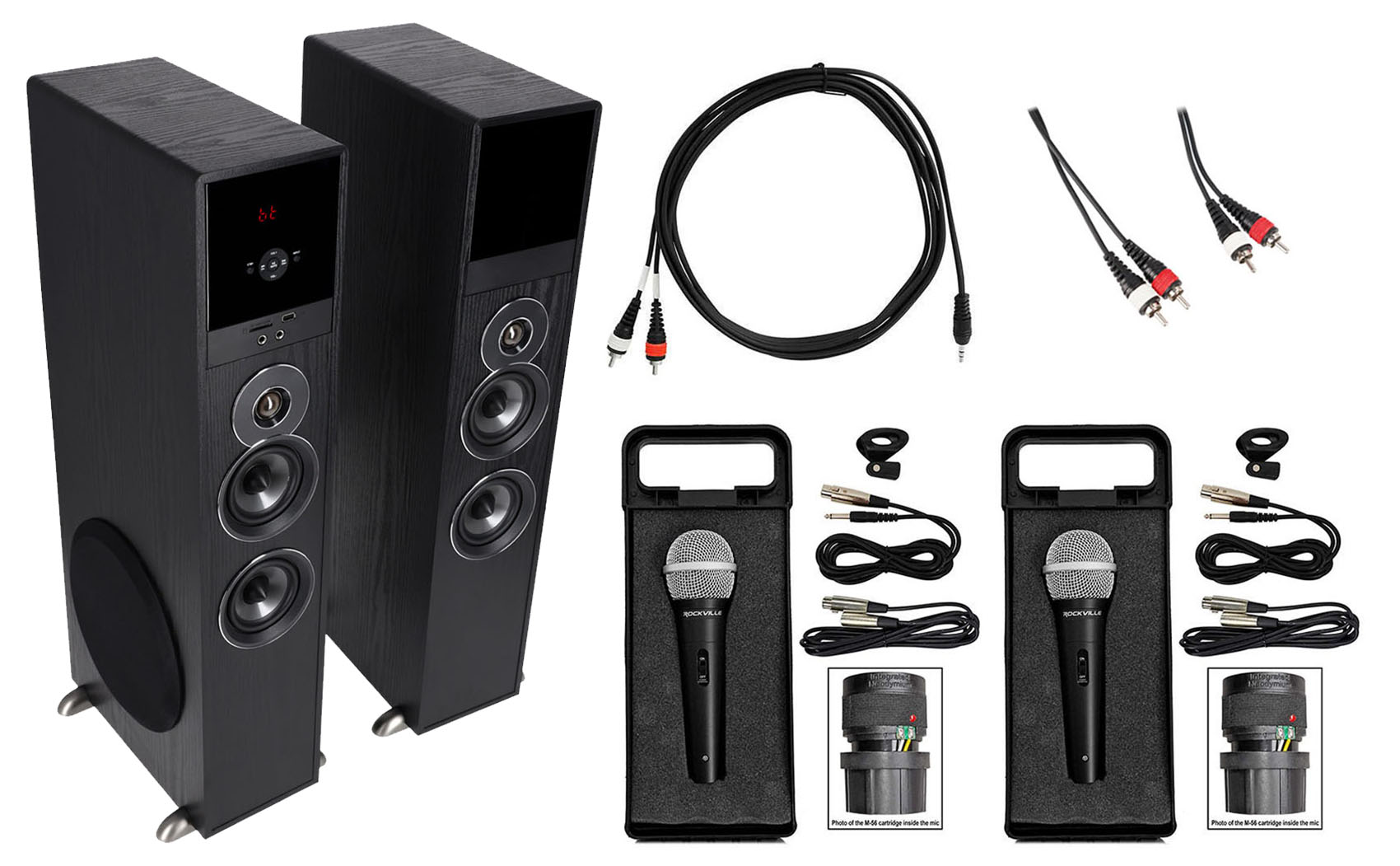 Package: Rockville TM80B Home Theater System Tower Speakers with 8" Subwoofer, USB, and Bluetooth in Black + Rockville RNRMR10 10' Nickel-Plated 3.5mm 1/8" TRS to Dual RCA Cable + Rockville RCDR10B 10' Nickel-Plated Dual RCA to Dual RCA Cable + Rockville RMC-XLR High-End Metal DJ Handheld Wired Microphone Mic w (2) Cables