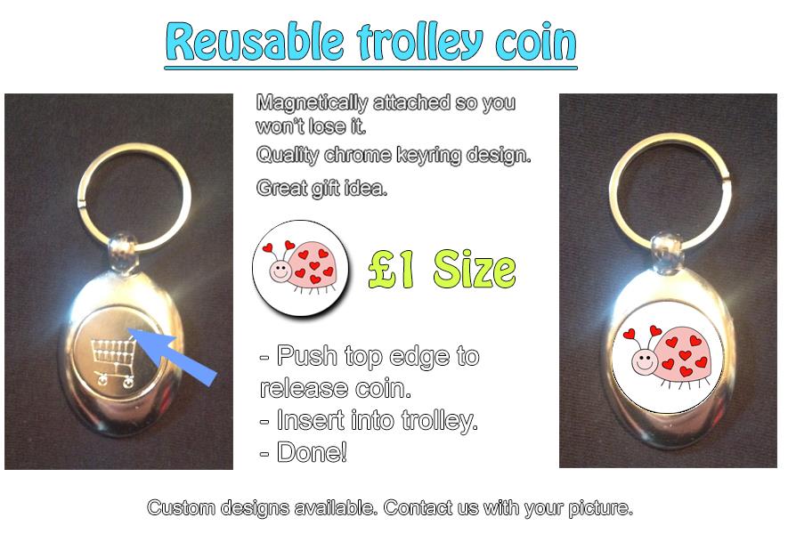 -Circular metal '£1' that magnetically clips on to a metal keyring.