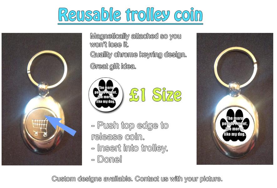 -Circular metal '£1' that magnetically clips on to a metal keyring.