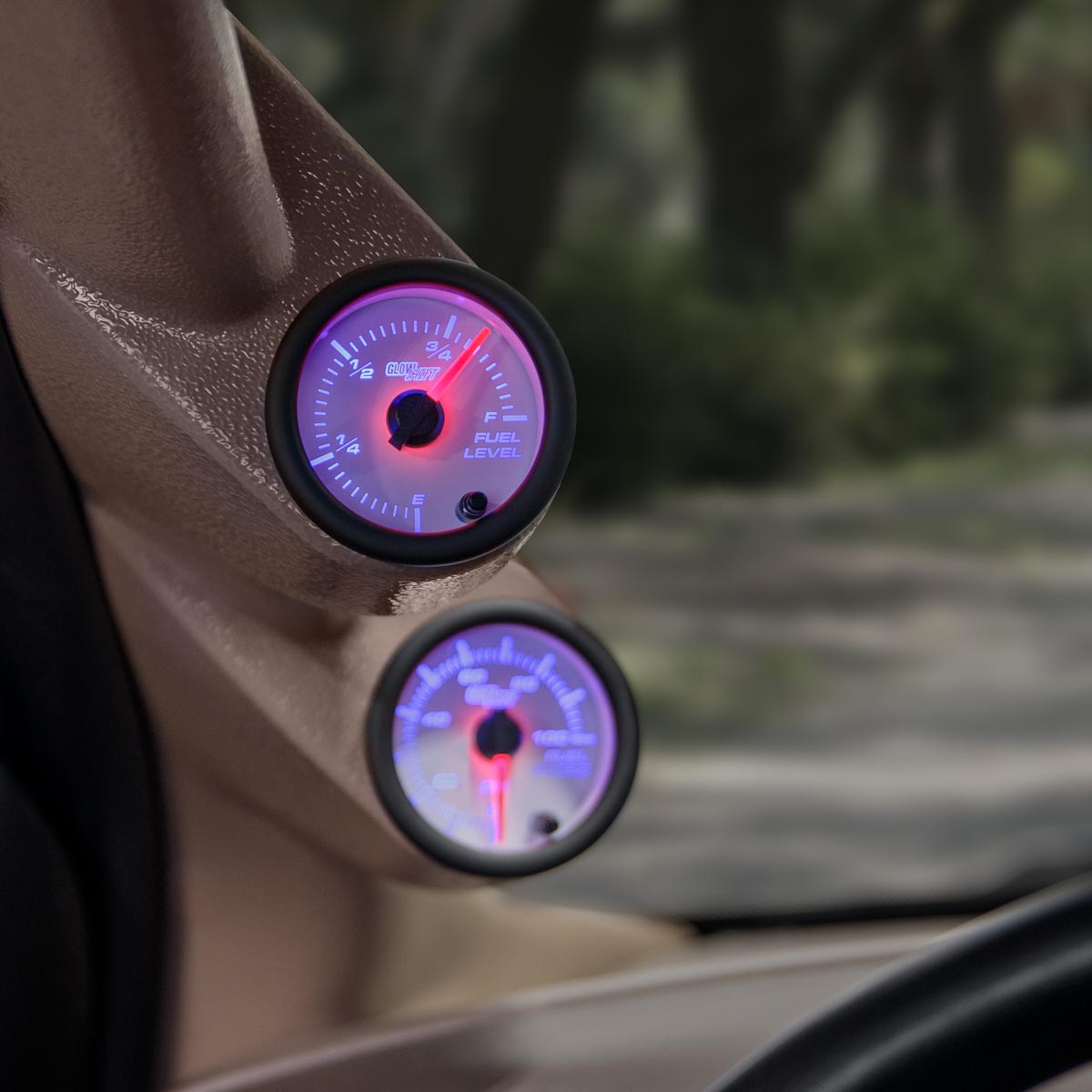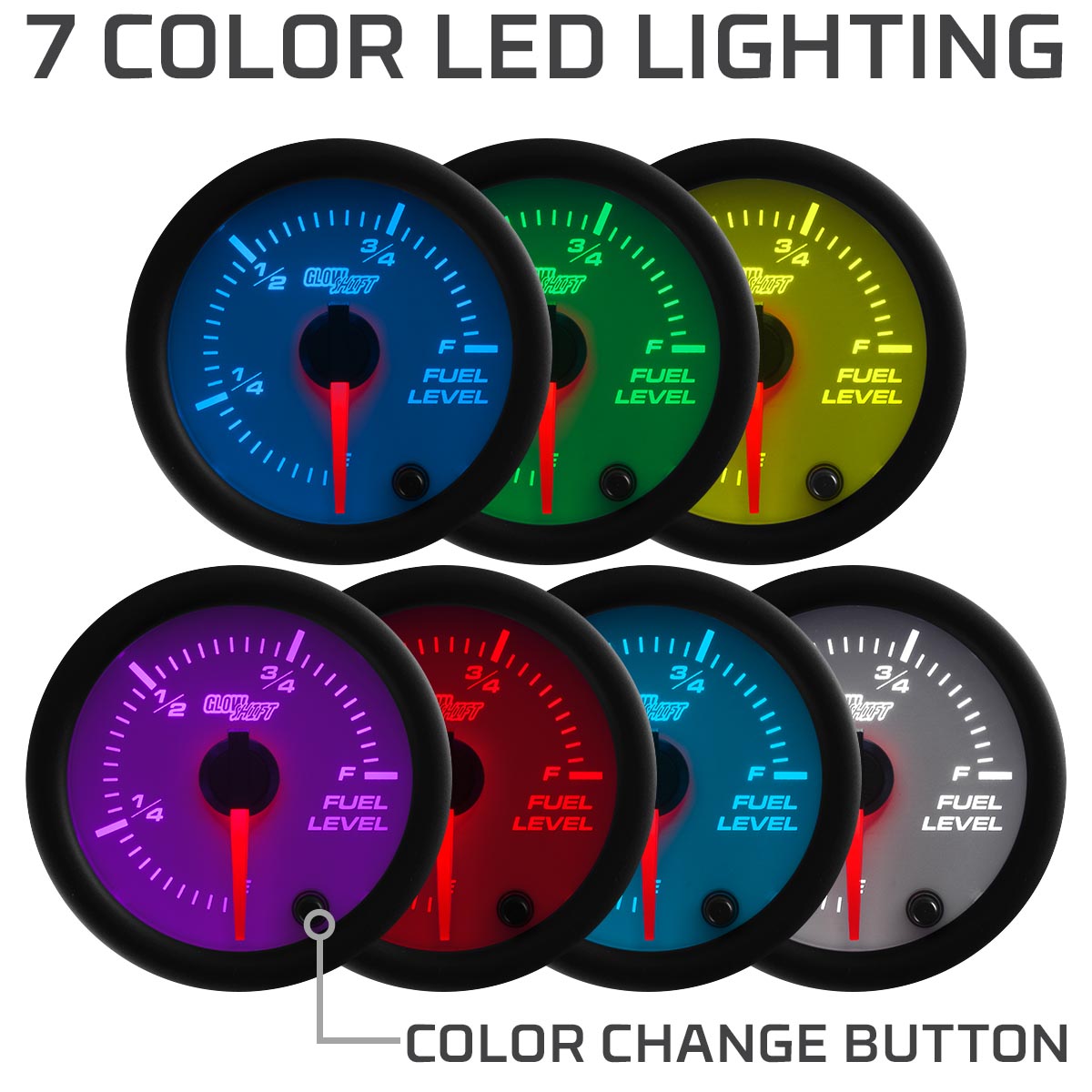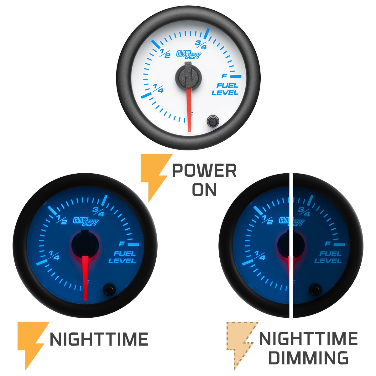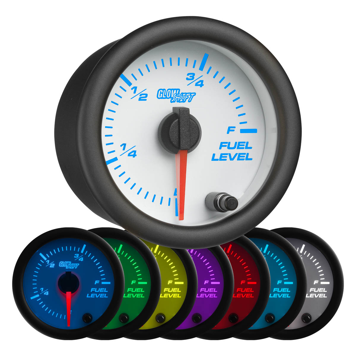 GlowShift White 7 Color Series Fuel Level Gauges for cars and trucks are optimal for any driver building a custom dash or looking to replace their stock fuel level gauge. This 2-1/16 (52mm) fuel tank gauge reads from Empty to Full in standard increments of Empty, 1/4, 1/2, 3/4, and Full with incredible accuracy. Youll be able to closely monitor the level of fuel in your vehicle. Each aftermarket fuel level gauge can be set to the factory OHM level on the factory sensor.