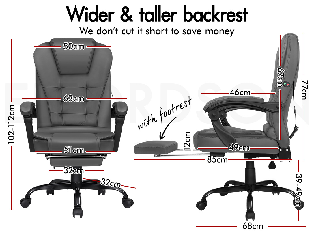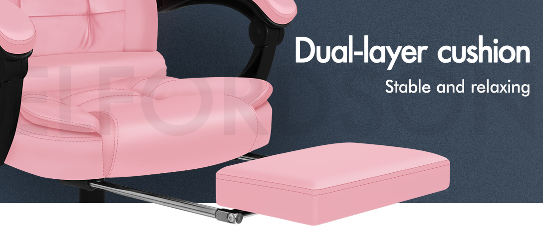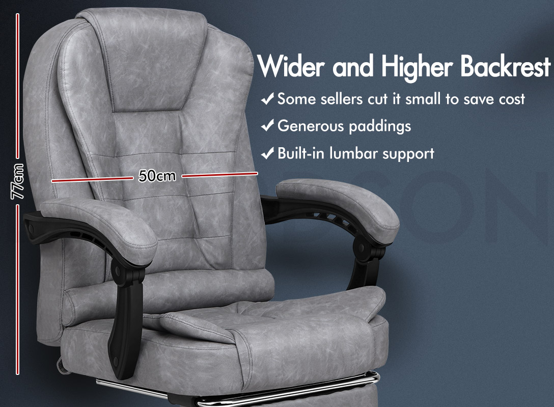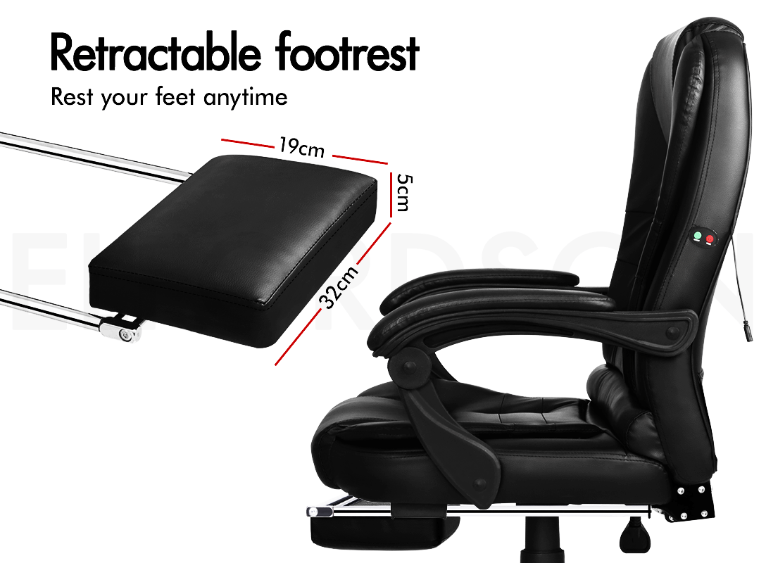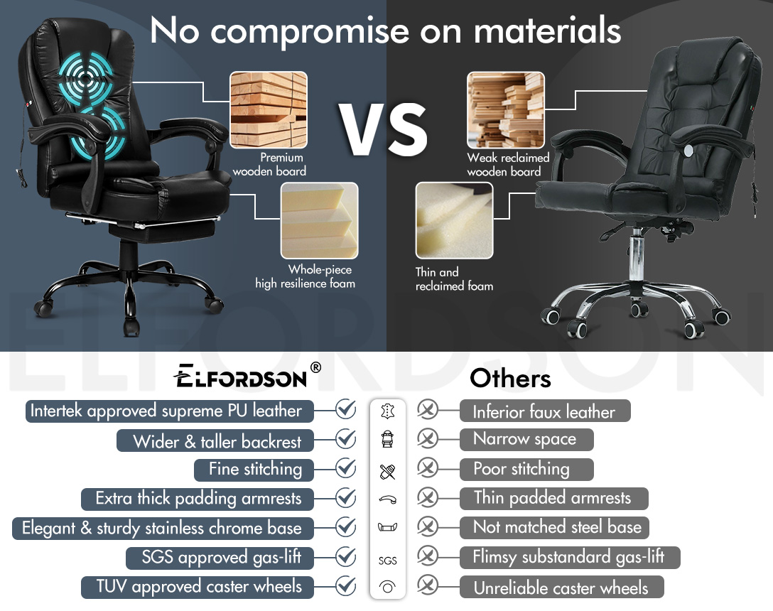 * Elfordson massage office chair with Footrest * Exclusive comfort for you* A reward at work * S-curve design, best fit for your body * No compromise on materials, we don't use recycled foam* Generous foam paddings, we don't cut it thin to save money * Up to 150 degree back recline adjustment * Able to lock the reclination position * Wider & taller backrest, we don't cut it short to save cost* Retractable padded footrest* Premium universal wheels, a smoothy experience * Deluxe tilt adjustment * Whole-piece moulding foam, better weight distribution and support* Smoothly 360 degree swivel * Deluxe PP plastic armrests with padding, wide and supportive * High resilience foam * Eliminates back and shoulder pressure * Steady chrome base, not as easy as plastic base to get dirty * Ideal for household and business uses