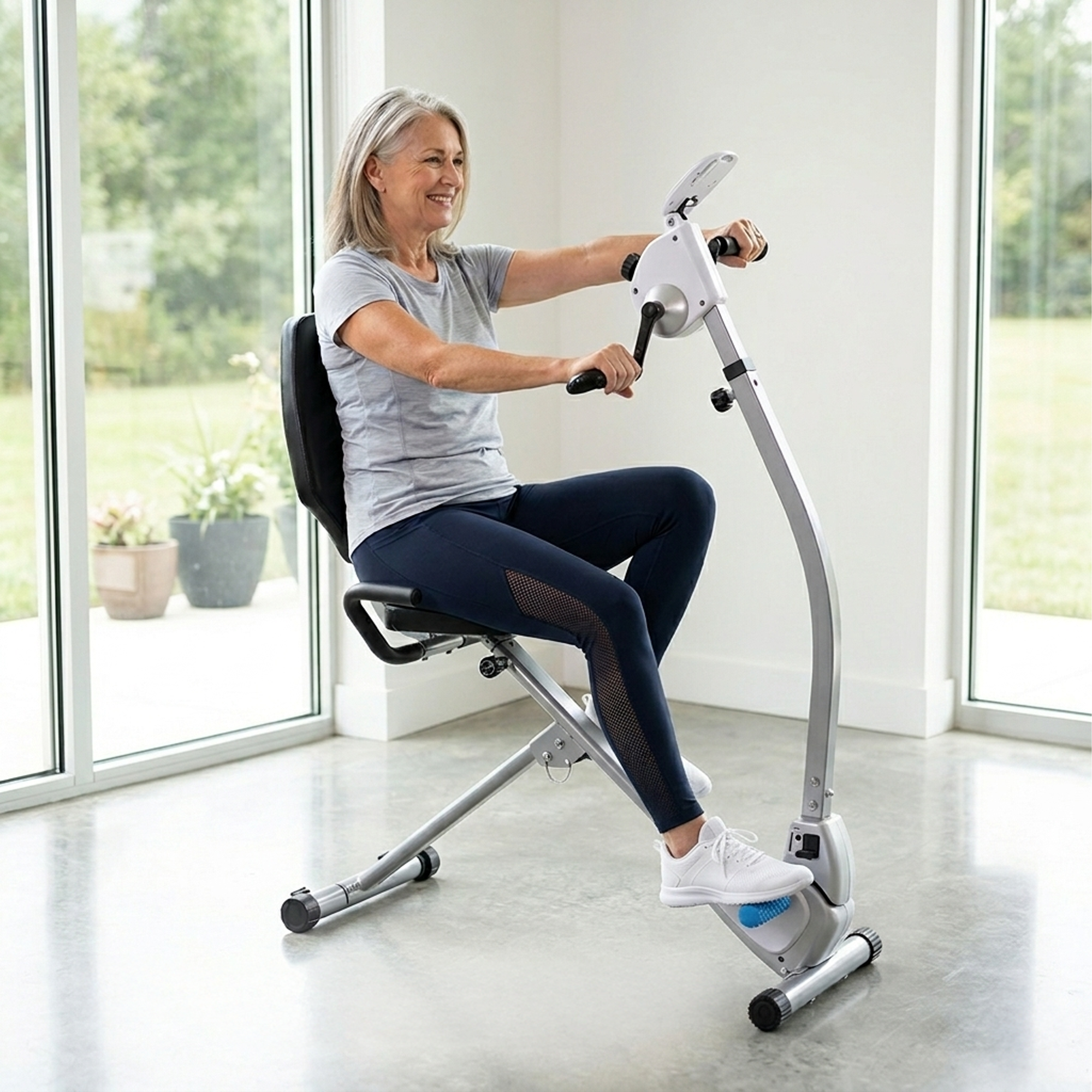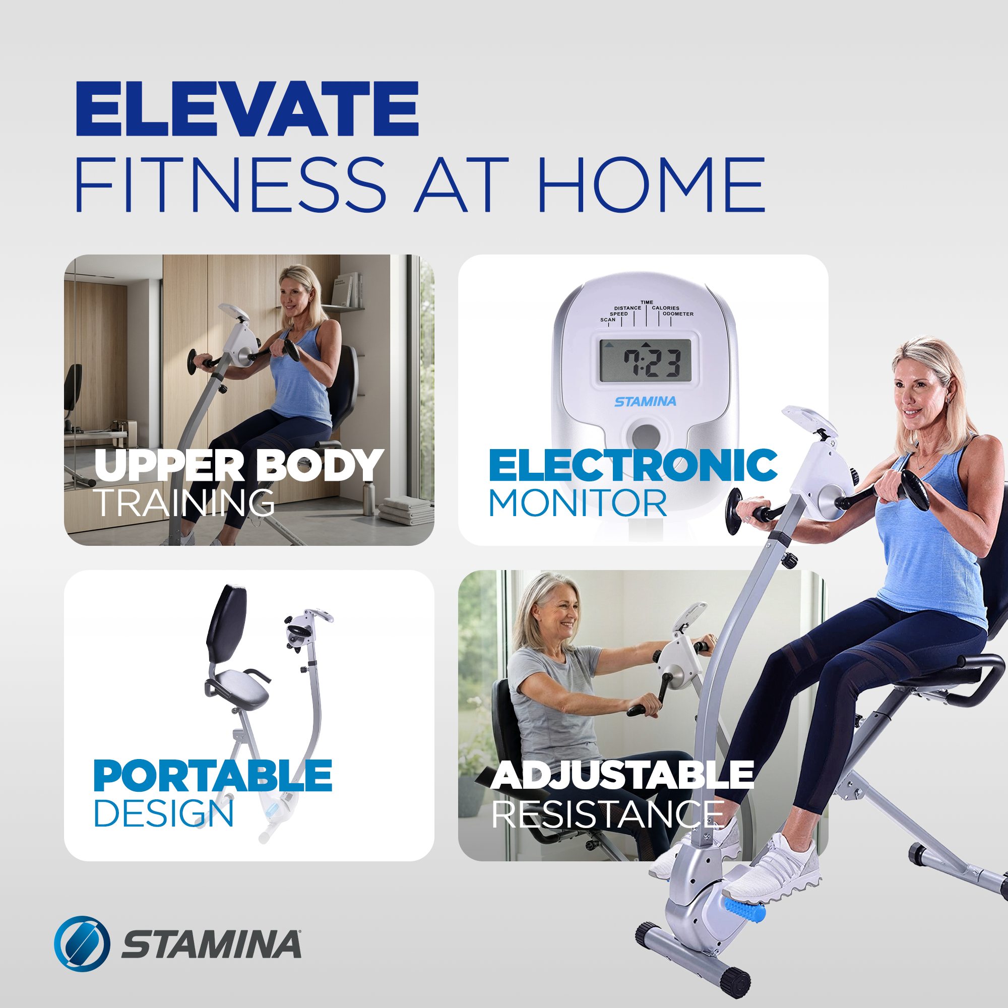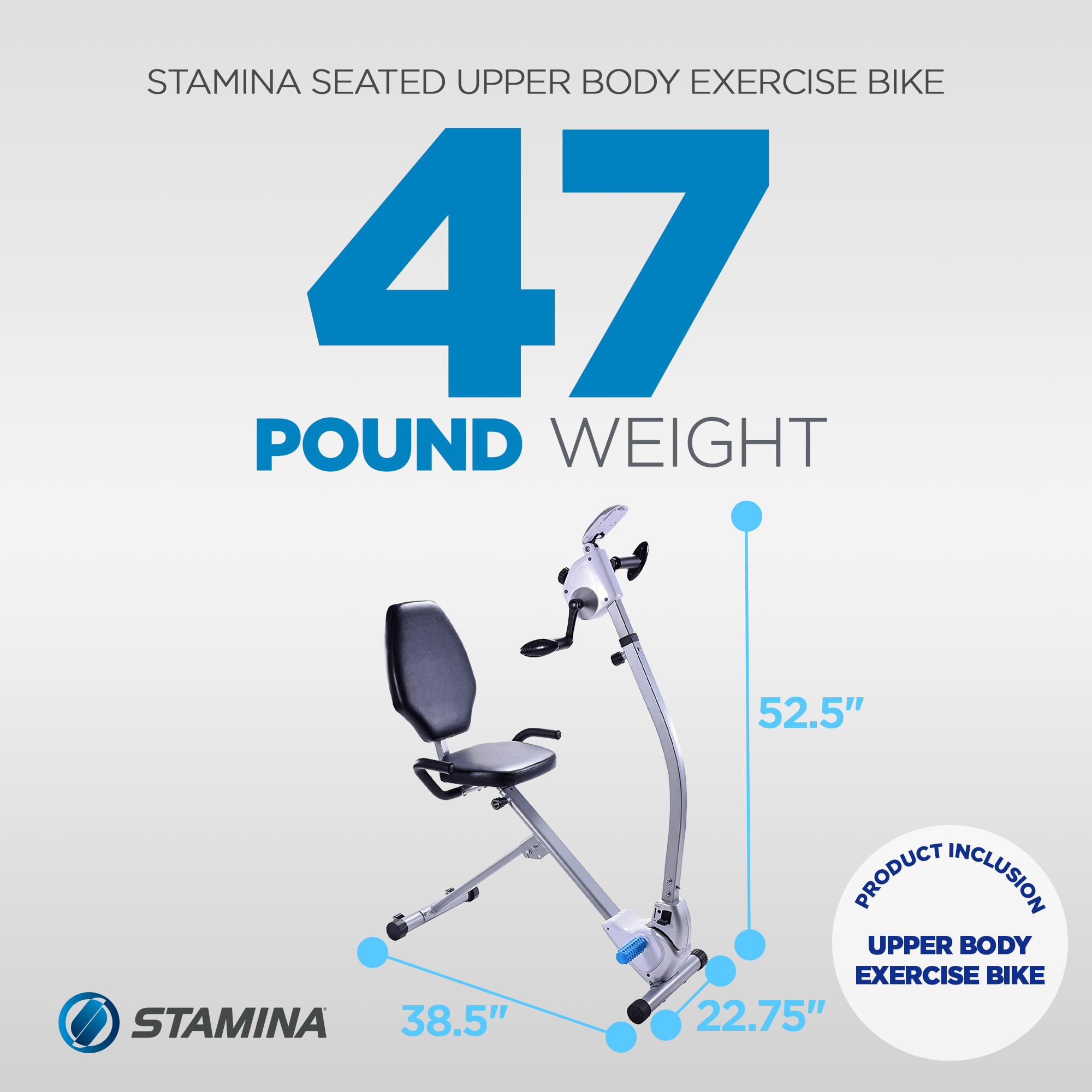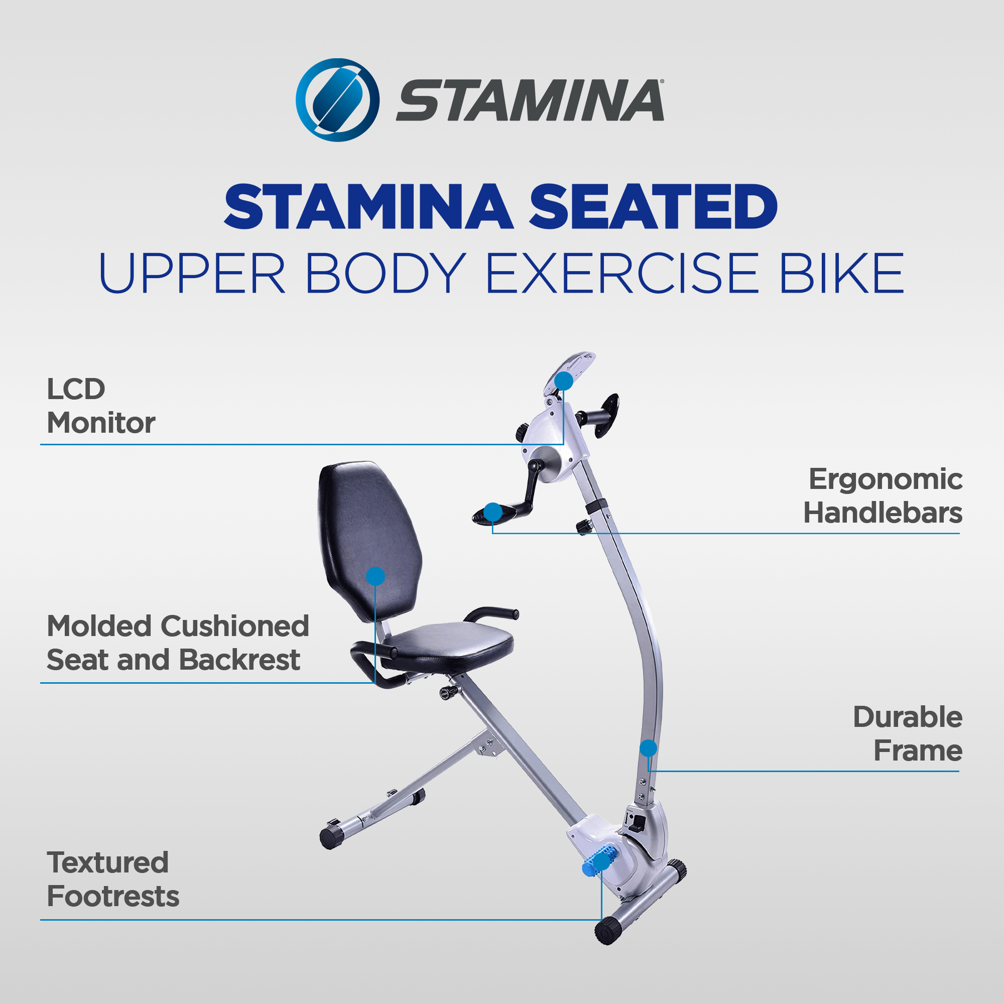 Boost cardio health, improve mobility, and tone muscle with the Stamina Upper Body Exercise Bike. The step-through design and side assistance handles make it easy to get on the stationary bike, even for users with limited mobility.