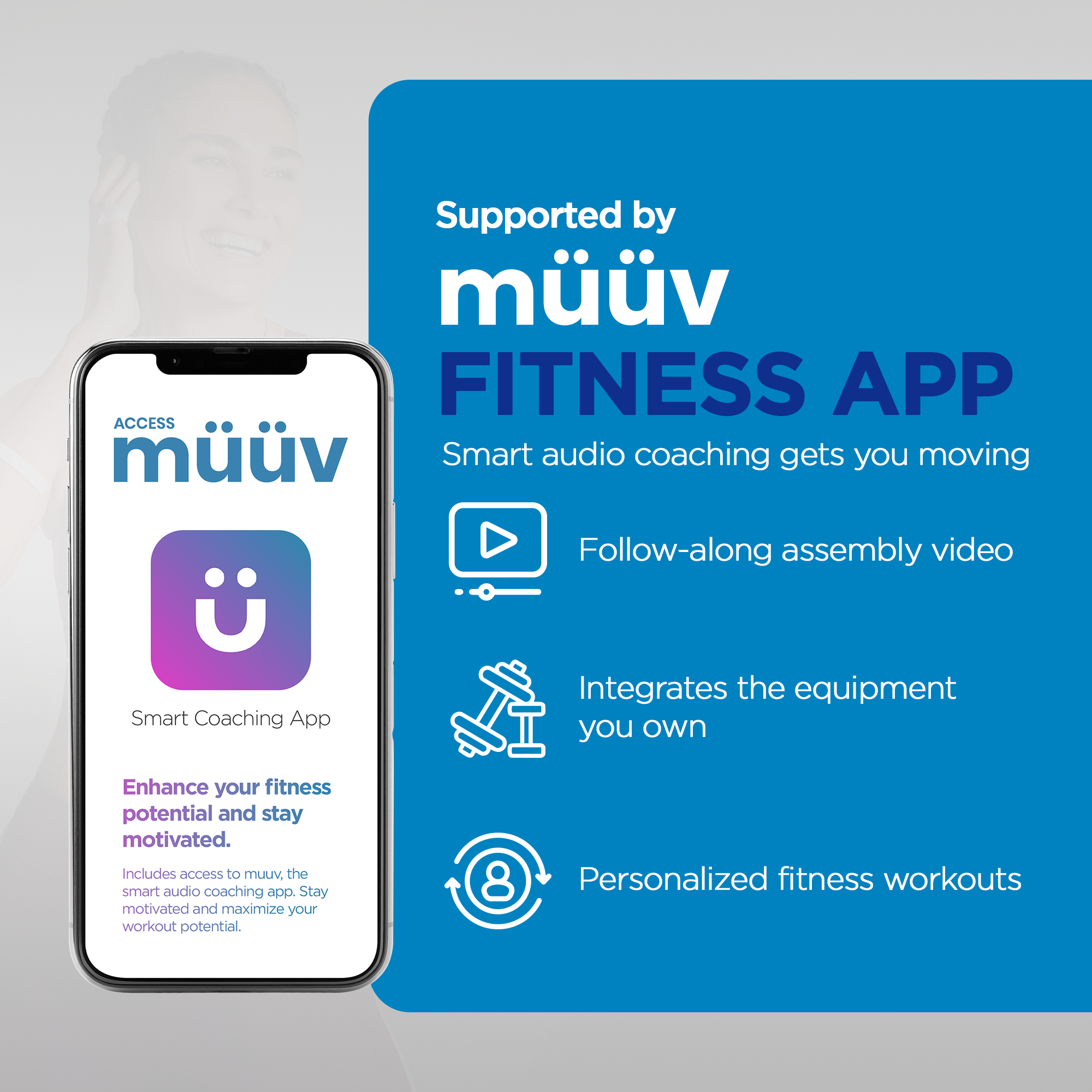 This product also includes free access to müüv, the smart audio coaching app that helps you add 500+ minutes per month with the right mix of cardio, strength, and flexibility for a healthy and sustainable lifestyle. You also get access to ad-free music and audio coaching that is personalized to your fitness goals while making it fun for you.