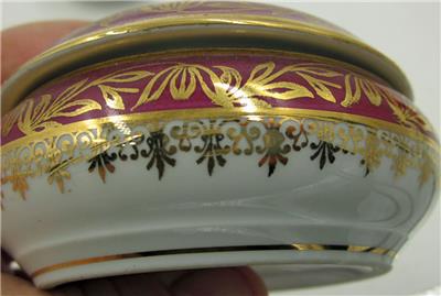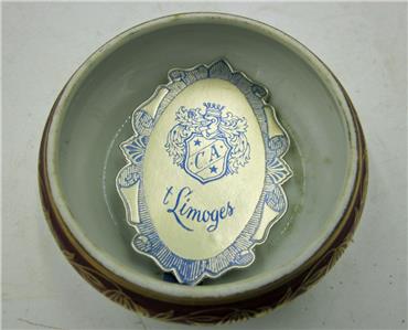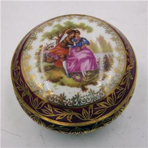 VINTAGE LIMOGES FRANCE ROUND TRINKET WITH GOLD TRIM COURTING COUPLE RARE ORIGINAL PAPER LABEL INSIDE. App. 3.5" in diameter