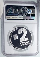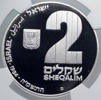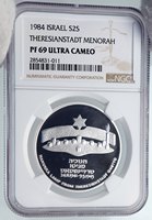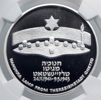 Israel - Hannukah Lamp Series - Theresienstadt Camp 1984 Proof Silver 2 New Sheqelim 37mm (28.00 grams) 0.850 Silver (0.787 oz. ASW) Reference: KM# 145 | Engraver: Gideon Keich Certification: NGC PF 69 ULTRA CAMEO 2854831-011 ISRAEL ישראל اسرائيل 2 שקל 1984 התשמ , Stylized denomination above Seal of Israel (Menorah), representing strips of metal used for the Menorah. חנוכיה, Hanukka Lamp from the Theresienstadt Ghetto and the inscription in Hebrew and in English : Hanukka Lamp from Theresienstadt Ghetto 24.11.1941-9.5.1945