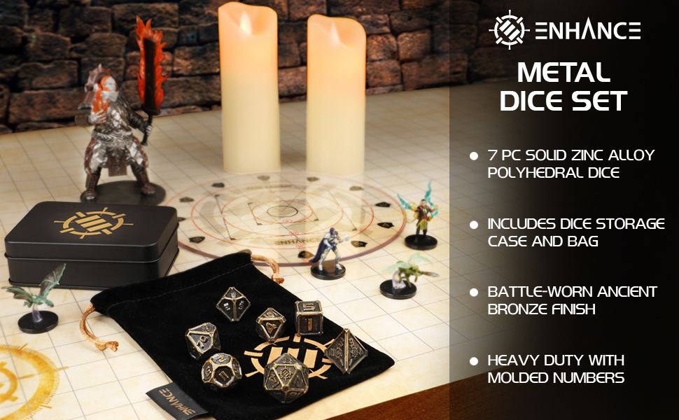ENHANCE metal dice were crafted to look like they've bore the brunt of many battles, so they're sure to garner envious looks at all your games. They are made out of zinc metal alloy and feature molded numbers to outlast the toughest dungeon battles during each hefty roll of fate.