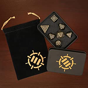 To ensure your character's complete preparation in battle, our metal dice set comes with a foam cushioned storage "vessel" to give your dice a secure place to travel in between rolls or games. In addition to that, every set comes with a velveteen drawstring pouch that can carry your dice and even store the tin case.