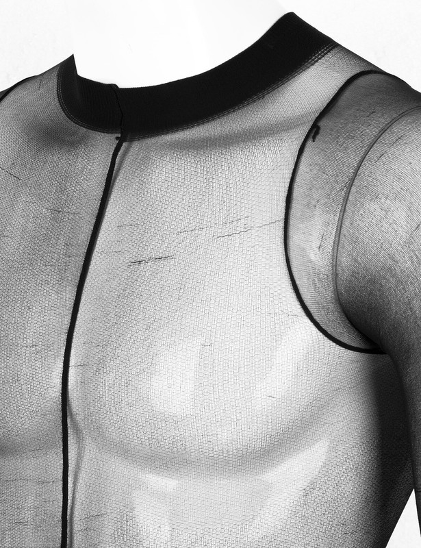 See through sheer full body design with open penis sheath, elastic neck and long sleeves, closed toes.
