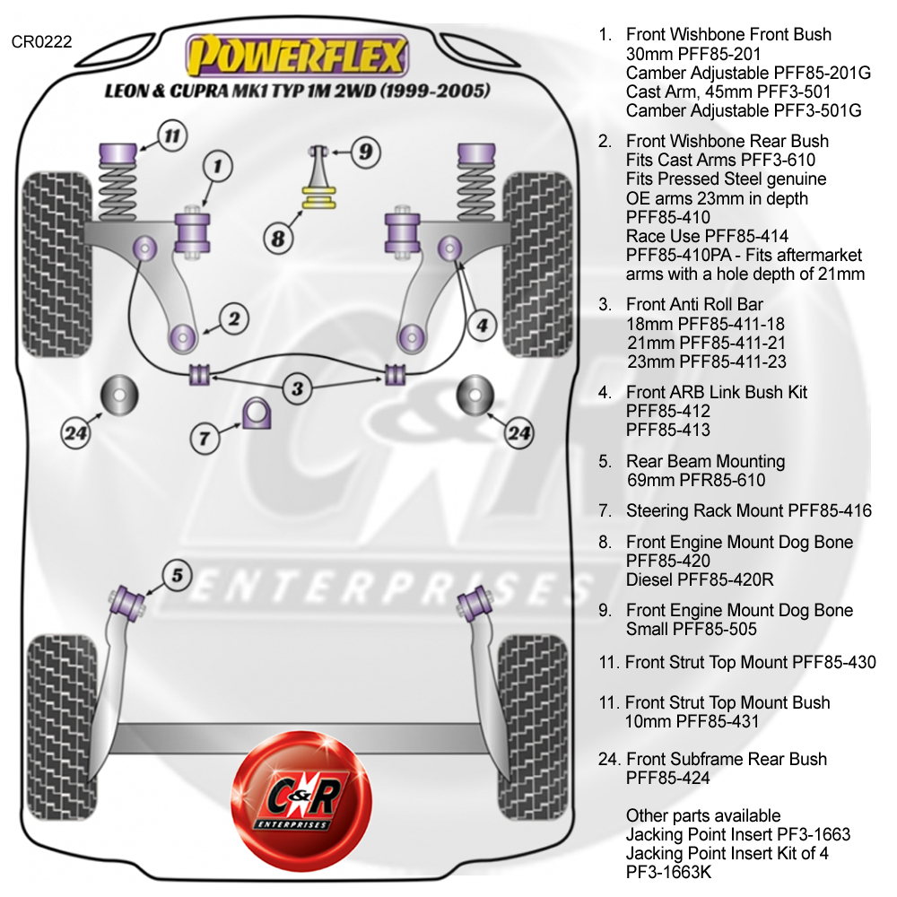 Um die korrekte PowerFlex Road oder Black Series Bush (ES) zu identifizieren, die Sie benötigen, lesen Sie bitte das Standortdiagramm weiter unten in der Liste.