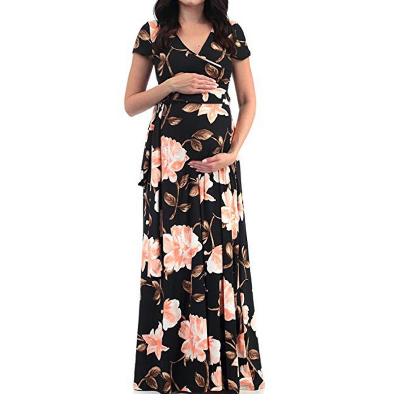 Floral Pattern Maternity Dress V Neck Short Sleeve Pregnancy Maxi Dresses with Belt.