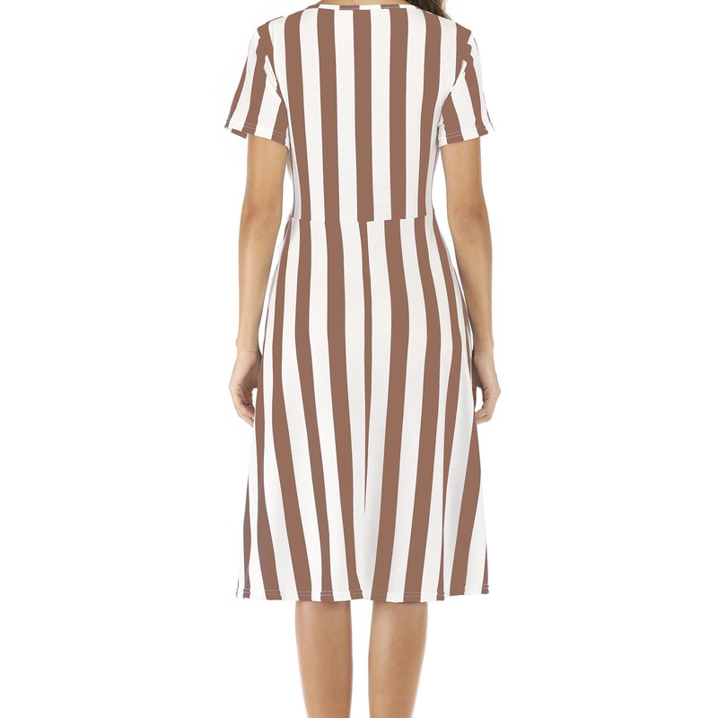 Features short sleeves, round neckline, stripe print and lace-up in the front, knee-length.